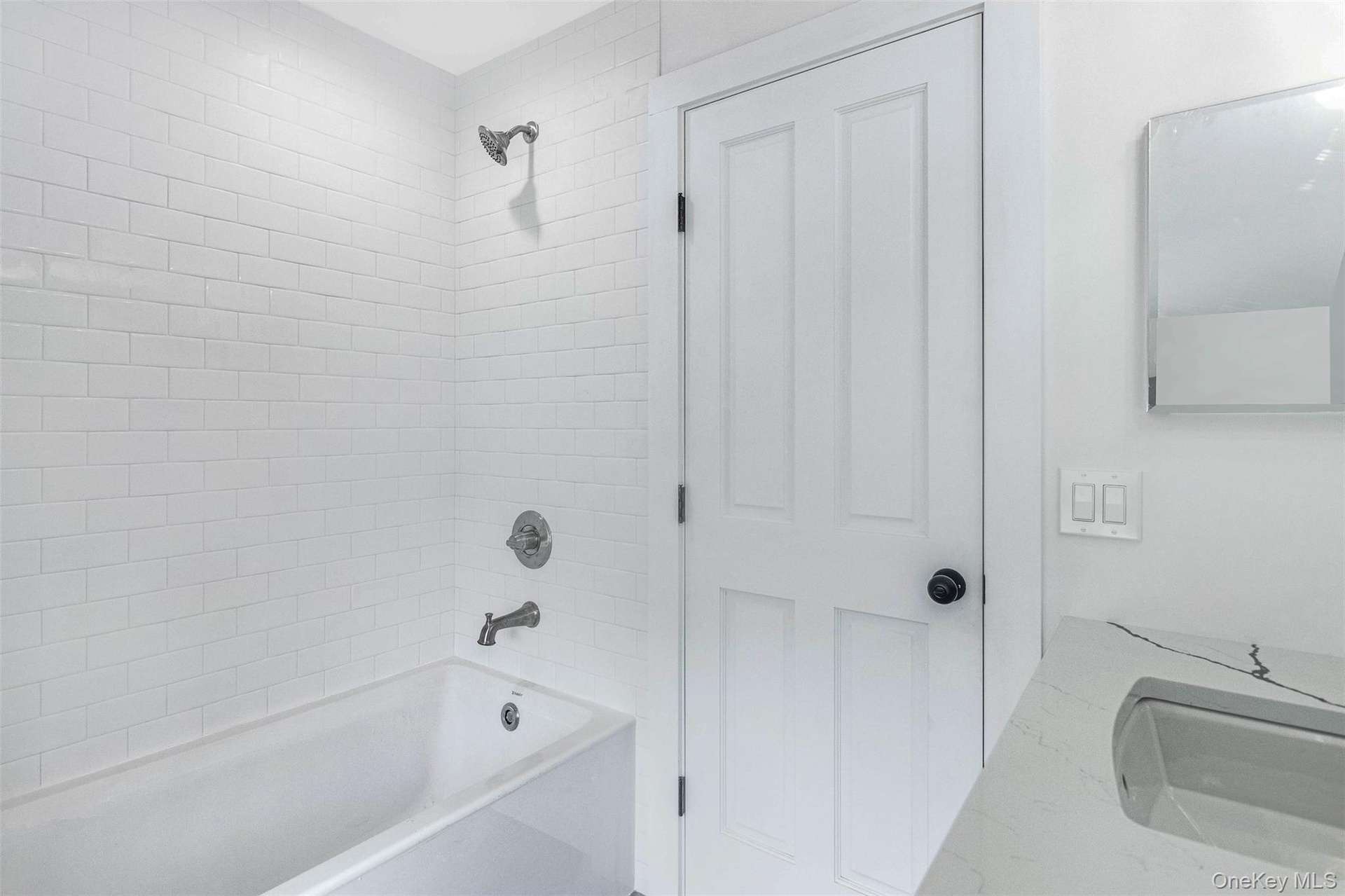- Full bathroom featuring lofted ceiling, plenty of natural light, double vanity, a shower stall, and tile patterned floors