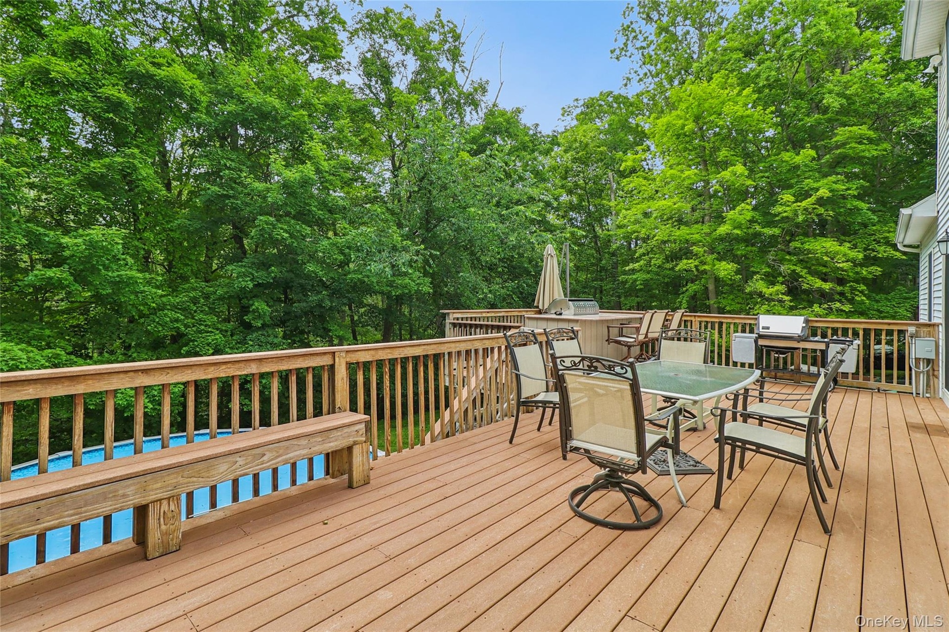 - Wooden deck featuring outdoor dining area leading to above ground pool