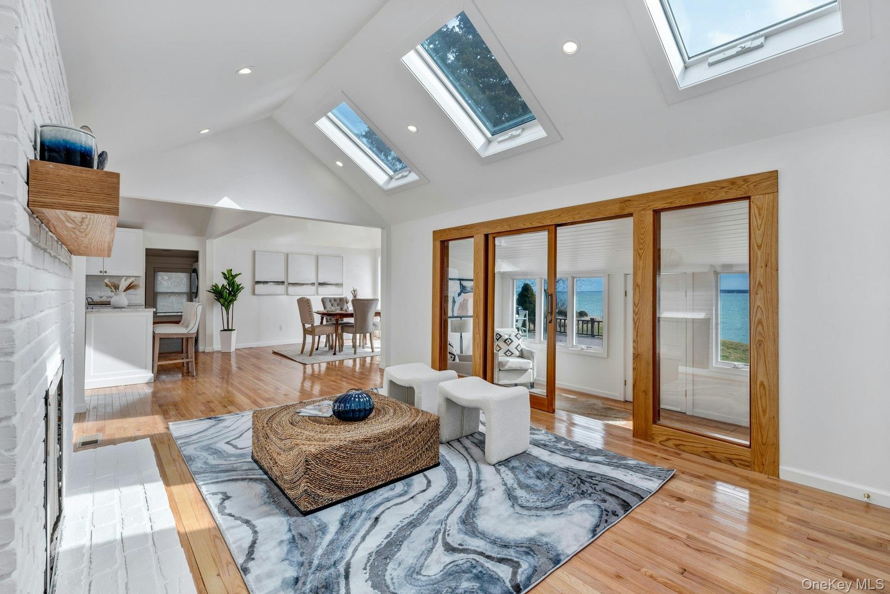 - Living room with high vaulted ceiling, light wood-type flooring, a fireplace, recessed lighting, and a skylight