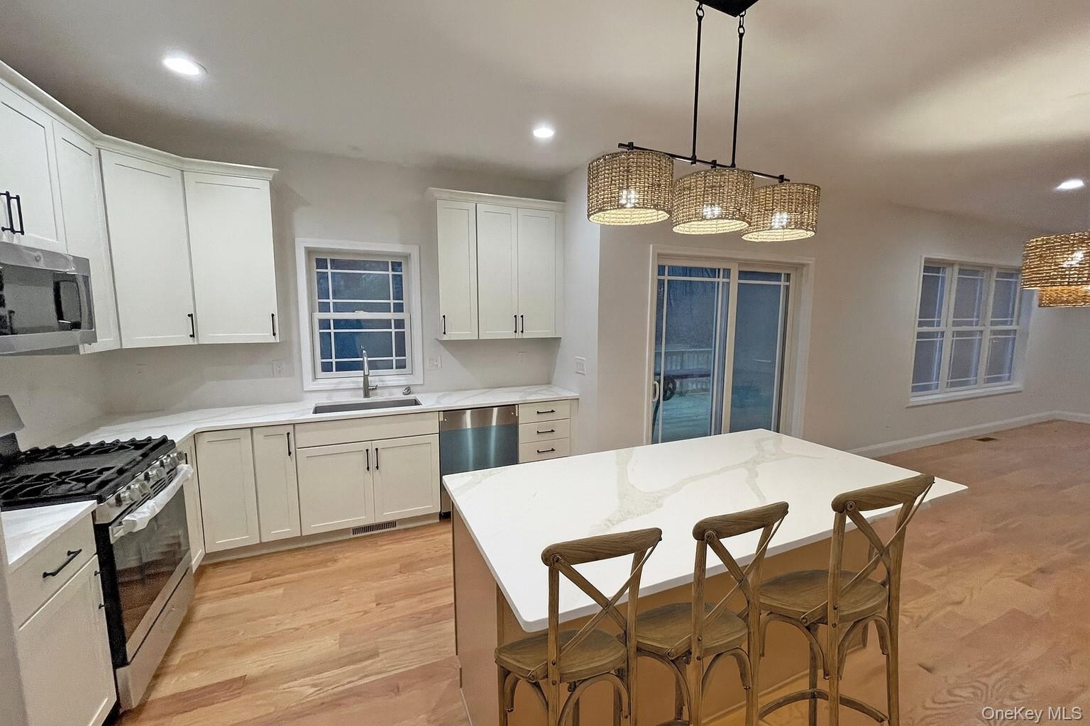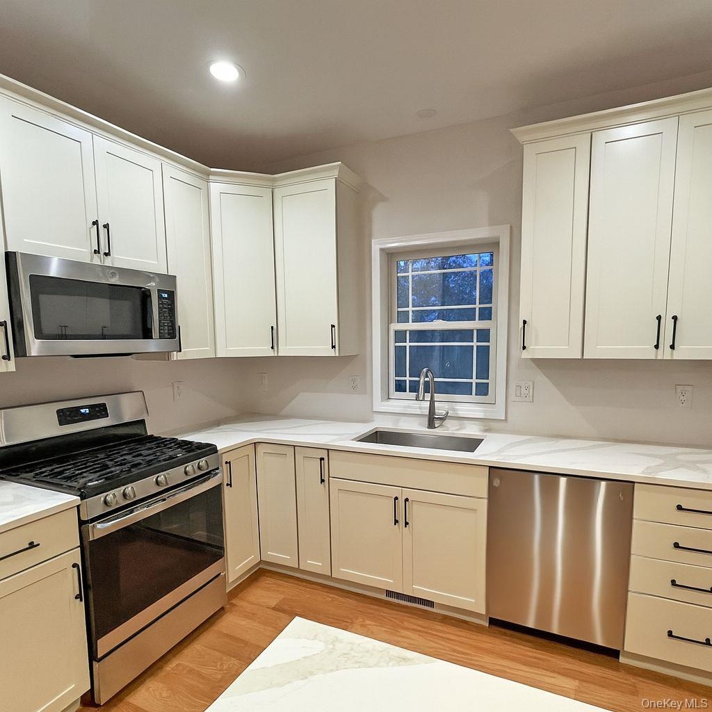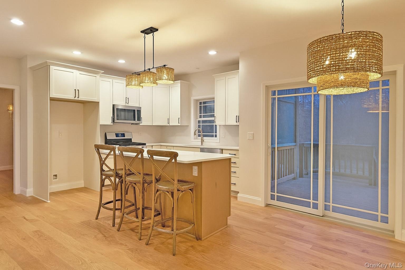 - Kitchen features white cabinets with wood tone island, quartz counters and stainless appliances (Virtually staged bar stools)