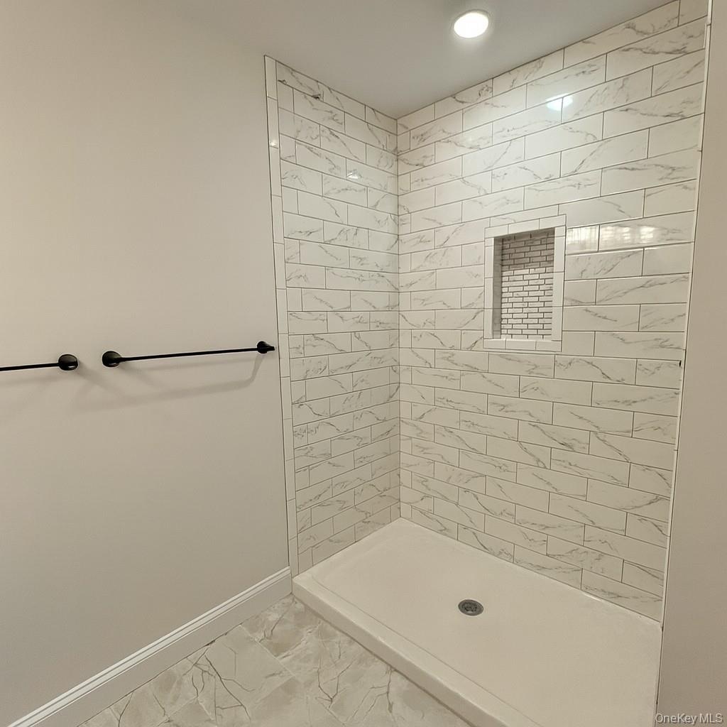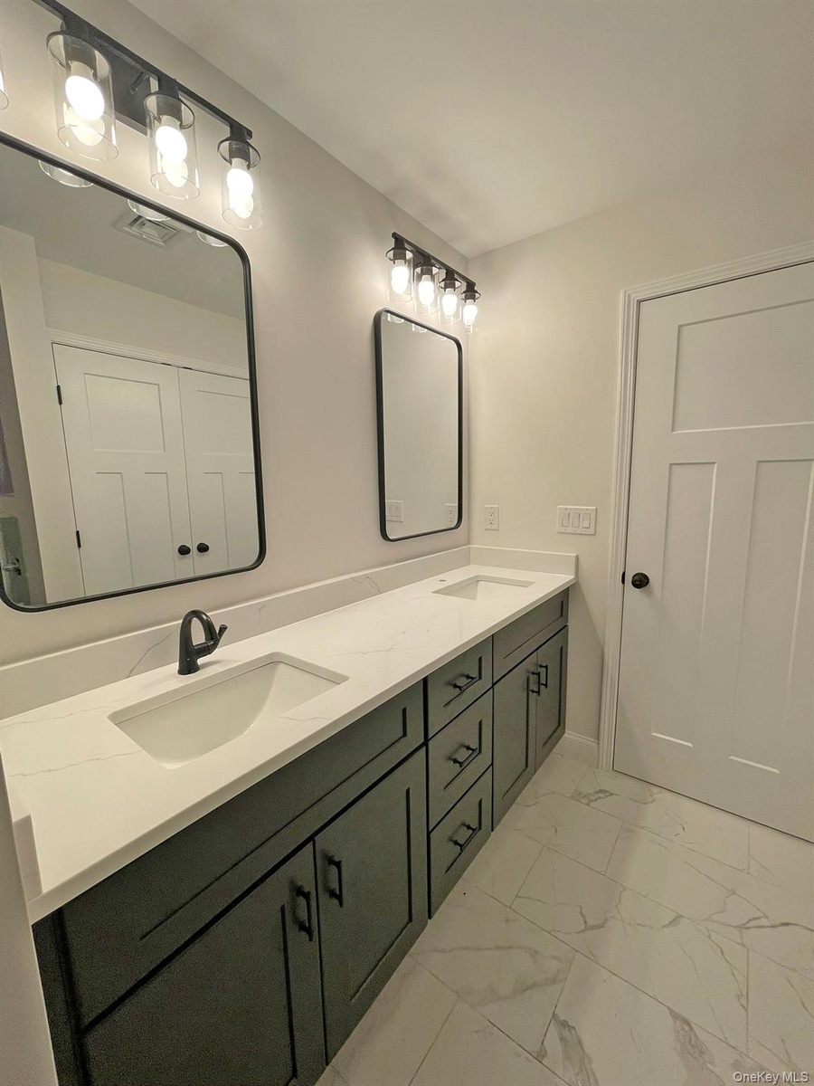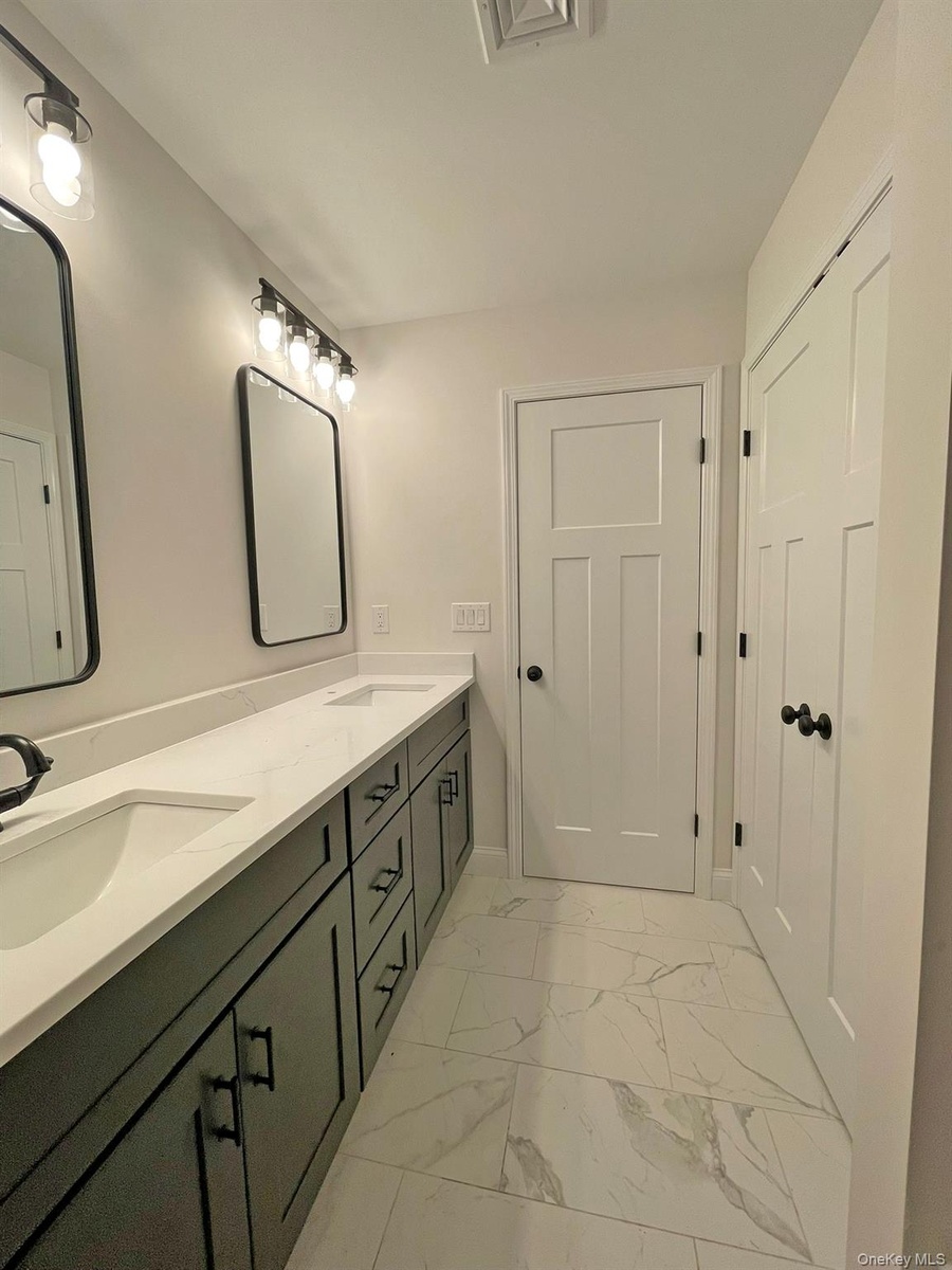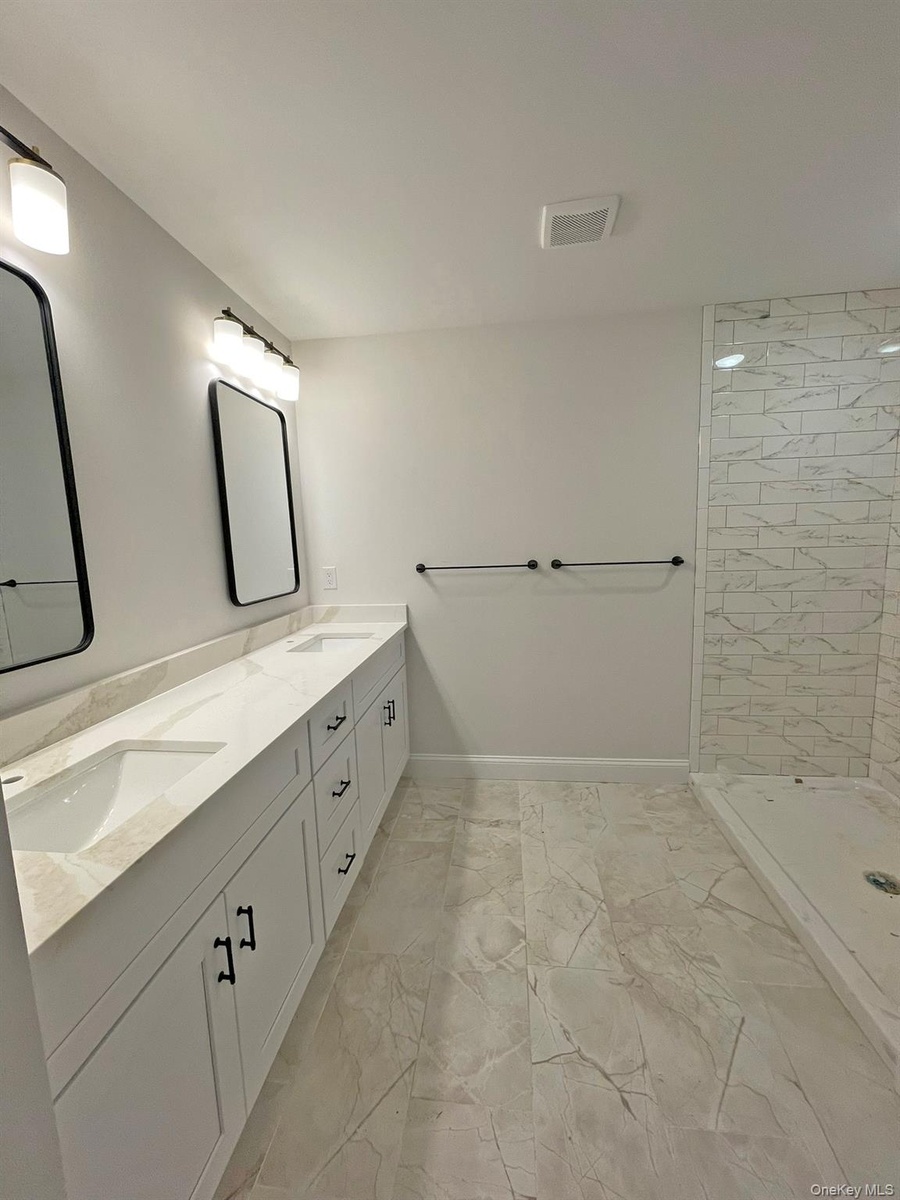 - Primary bathroom features double bowl vanity, tiled shower and large linen closet