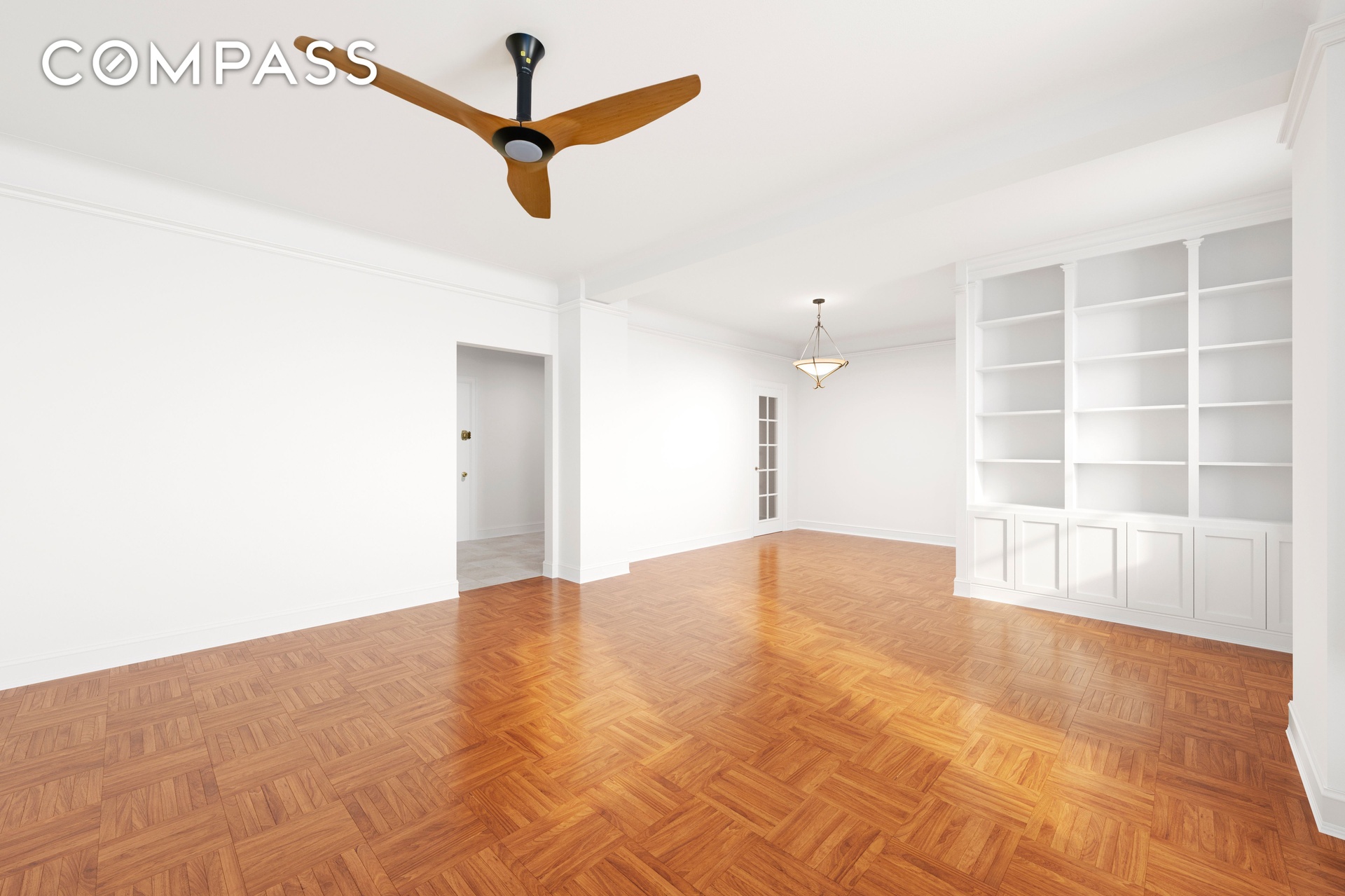 Inside this sprawling home, tall ceilings rise above classic millwork, parquet and tile floors, glass doors, and oversized windows along the eastern and southern exposures. The oversized foyer makes an inviting first impression. Ahead, the open-plan living/dining room is perfect for relaxing and entertaining alongside built-in cabinetry and a contemporary ceiling fan.