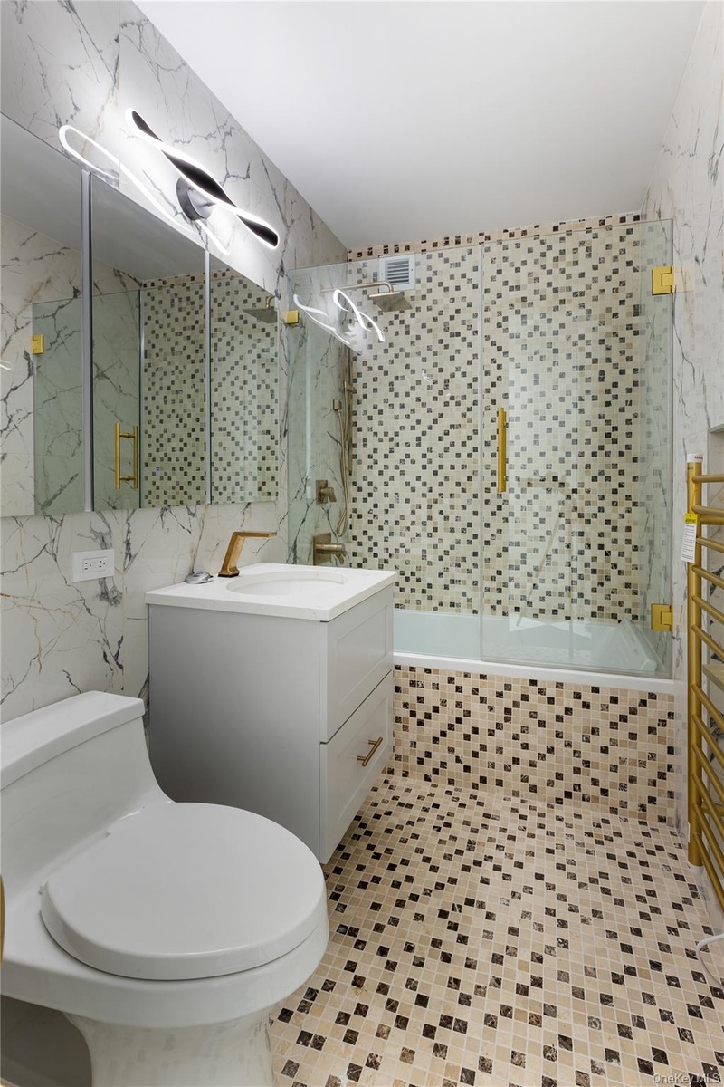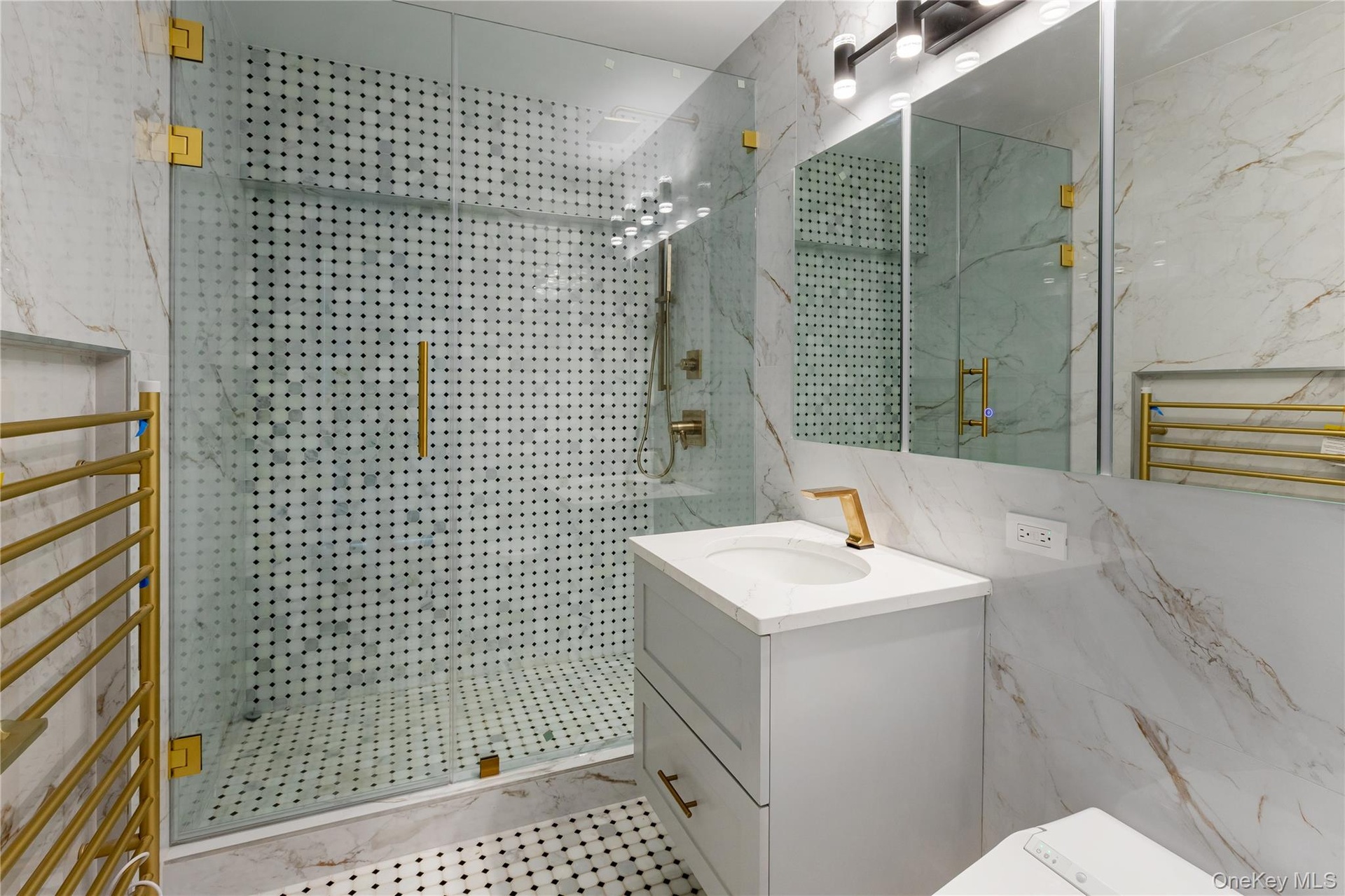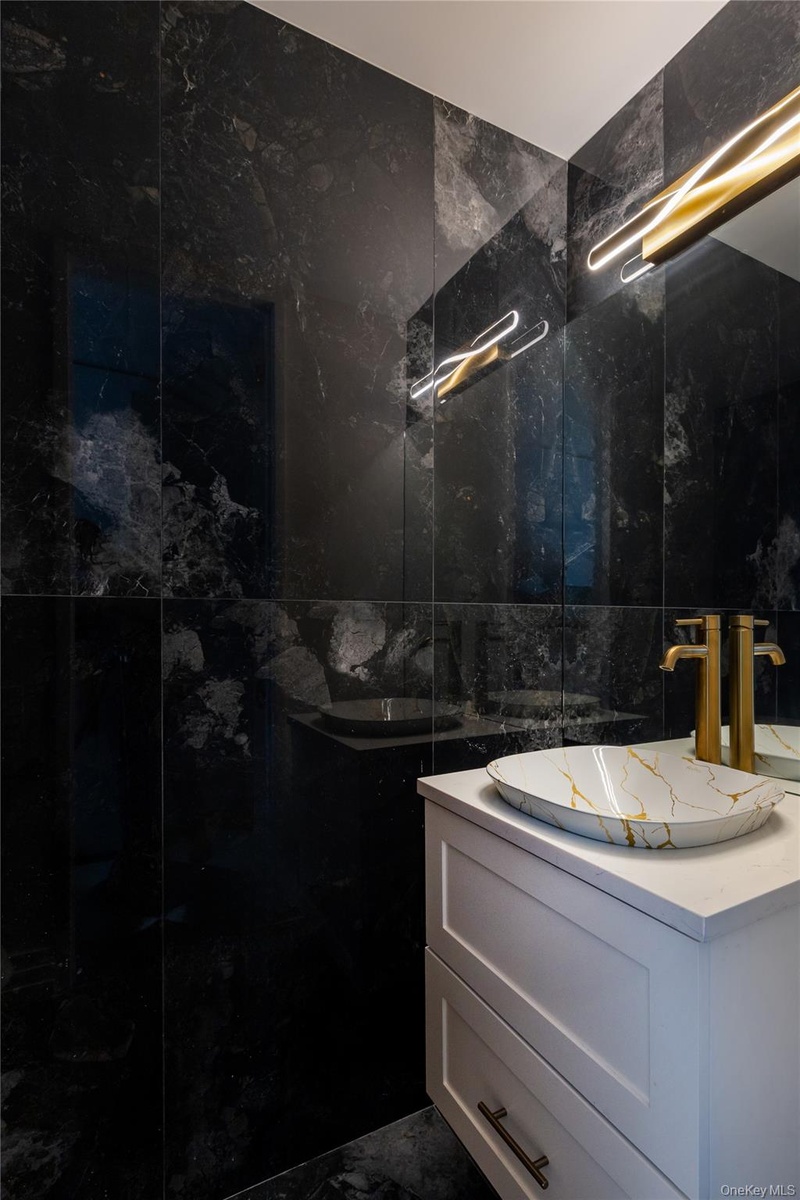 - Full bathroom featuring a marble finish shower, vanity, and tile walls