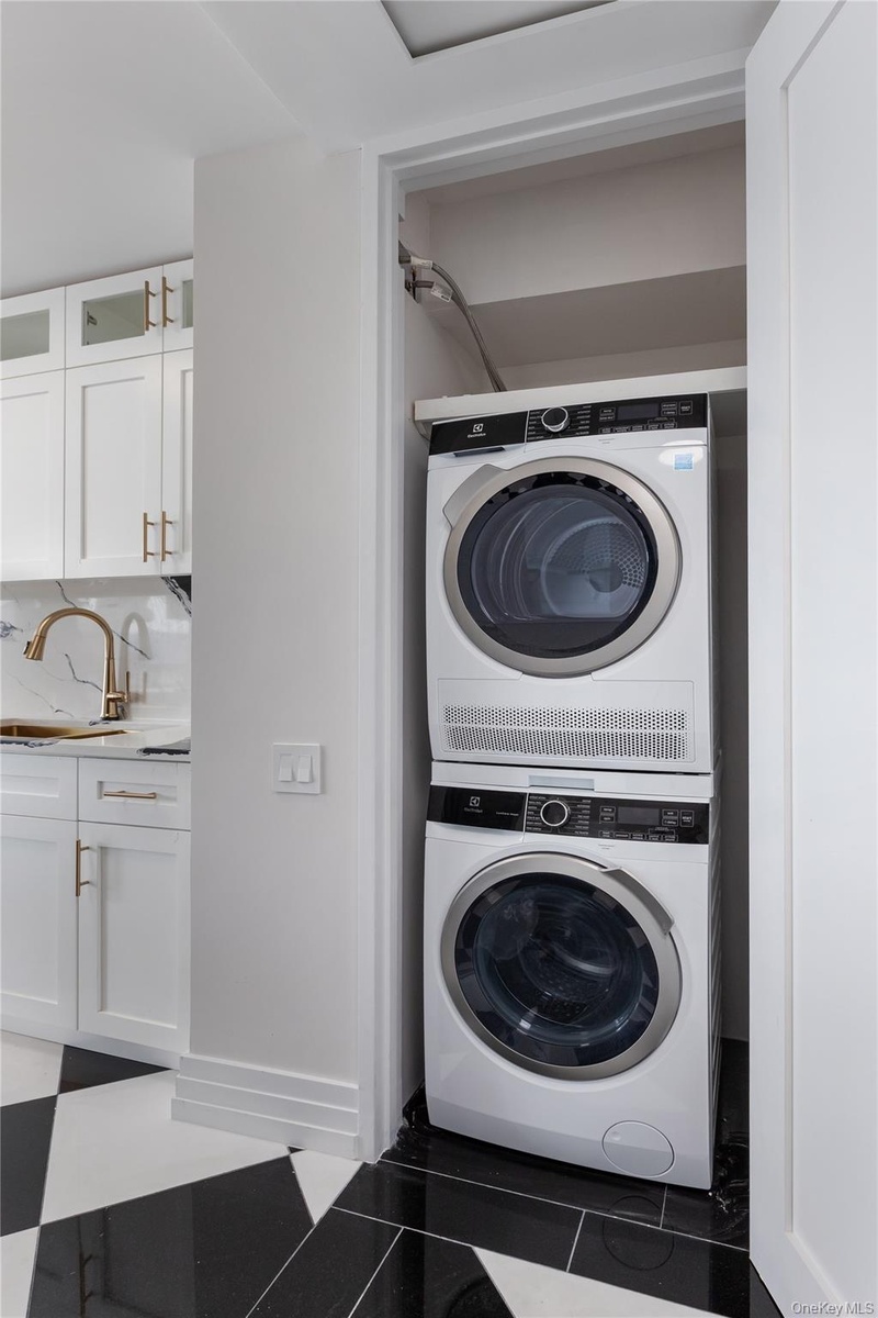 - Laundry room with stacked washer / dryer and tile patterned flooring