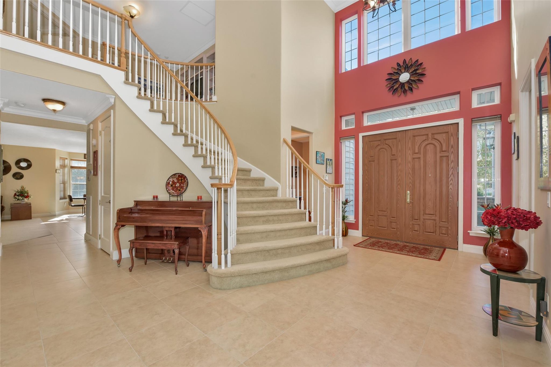 - Entrance foyer featuring a high ceiling, stairs, and crown molding