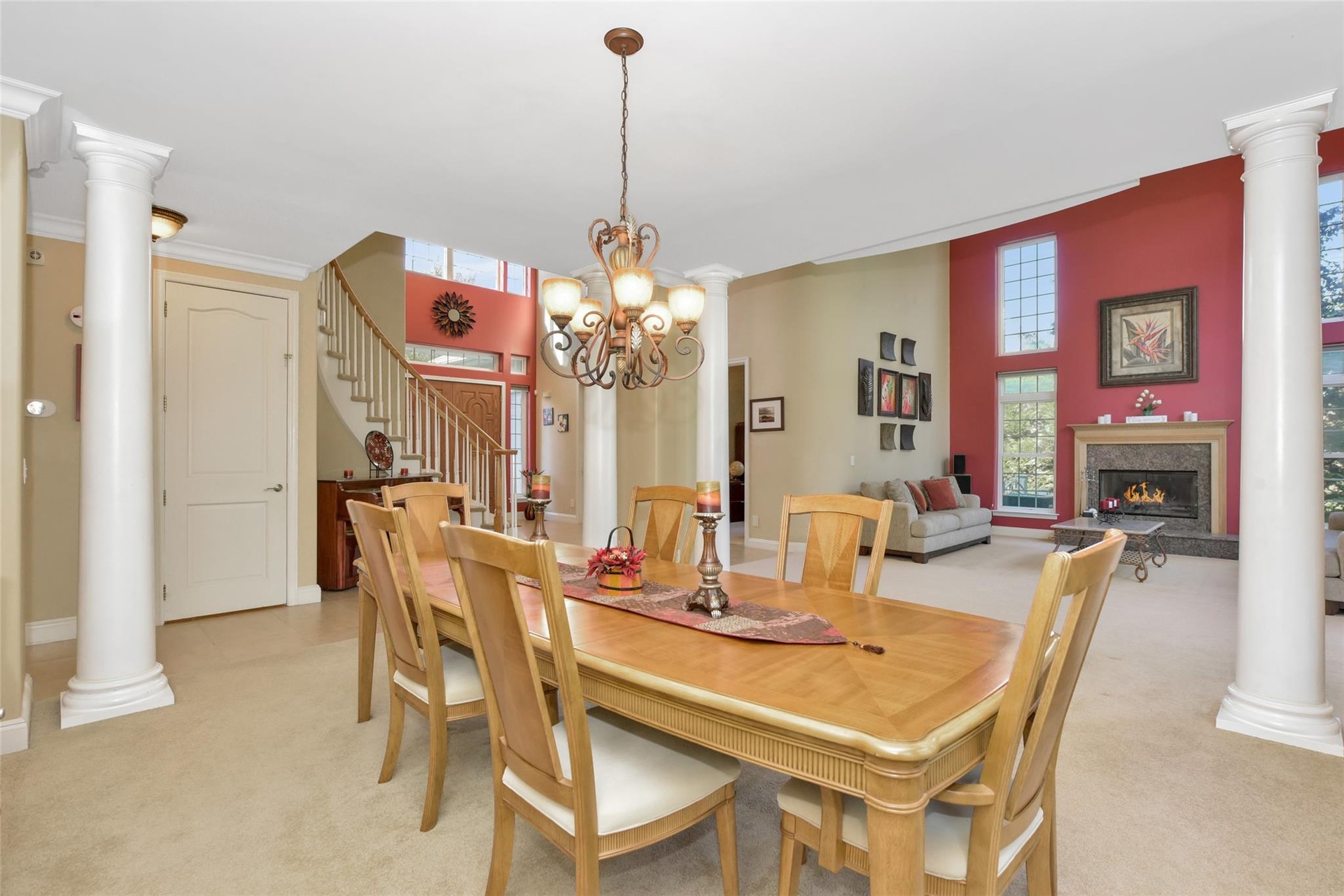 - Dining area featuring light colored carpet, stairway, a chandelier, ornate columns, and a fireplace