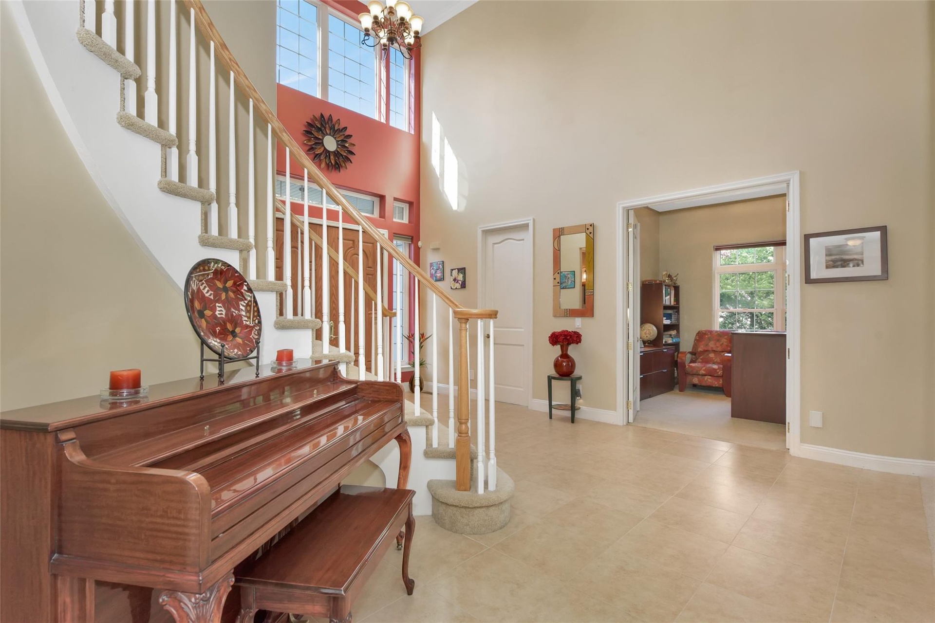 - Entryway featuring a chandelier, a towering ceiling, and stairs