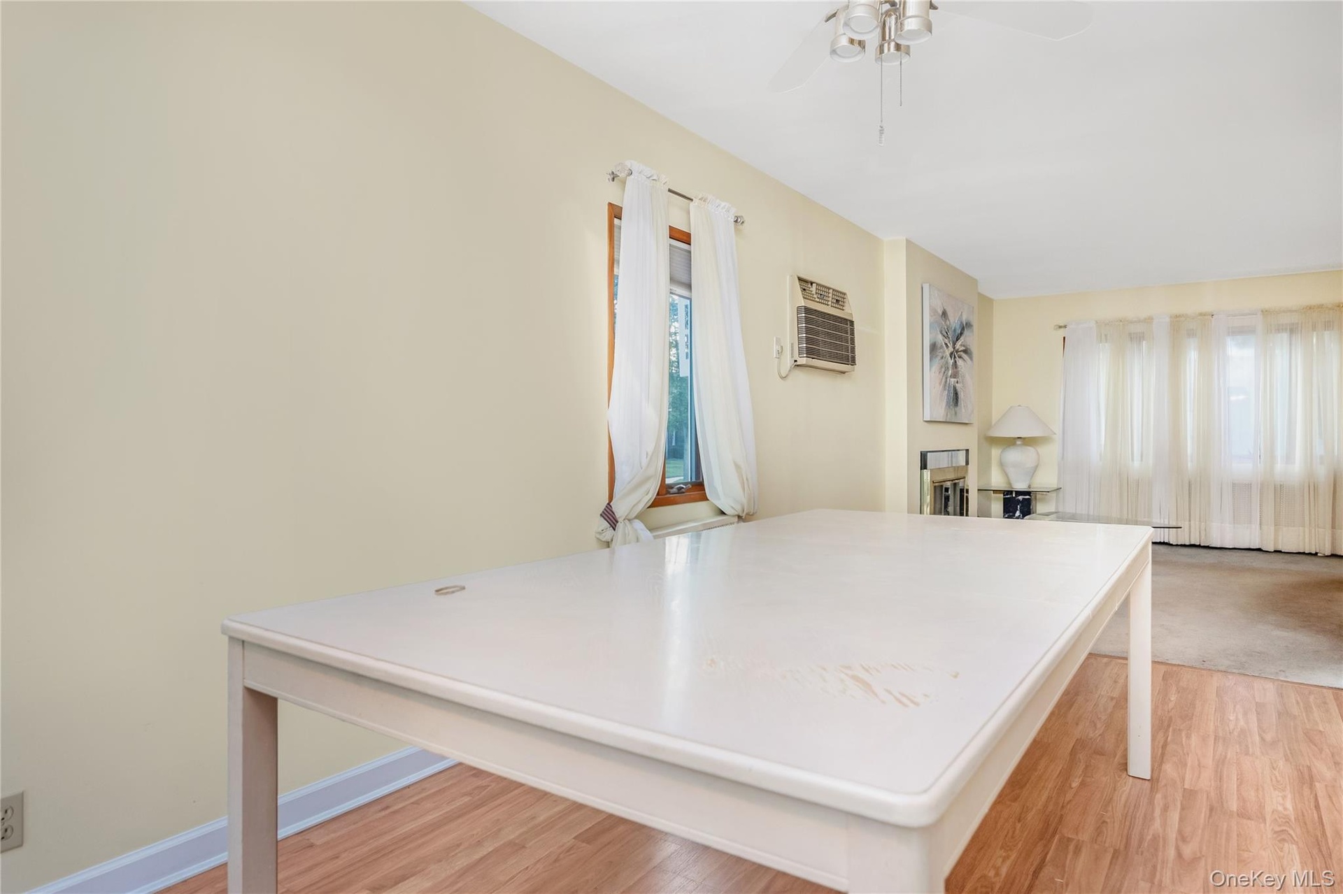 - Living room with carpet, a fireplace, a wall mounted air conditioner, and a ceiling fan