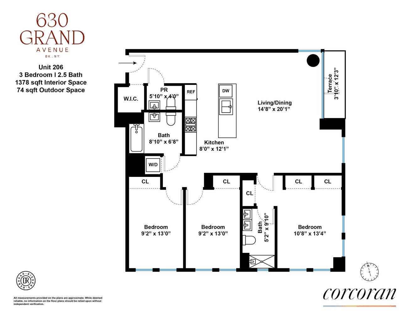 Unit 206 is a spacious 3 bedroom home with not only a living room large enough for dining AND living comfortably, but also an additional powder room PLUS an ensuite full bathroom, a secondary bathroom, and a terrace off of the living room, so that you can entertain guests in style.
