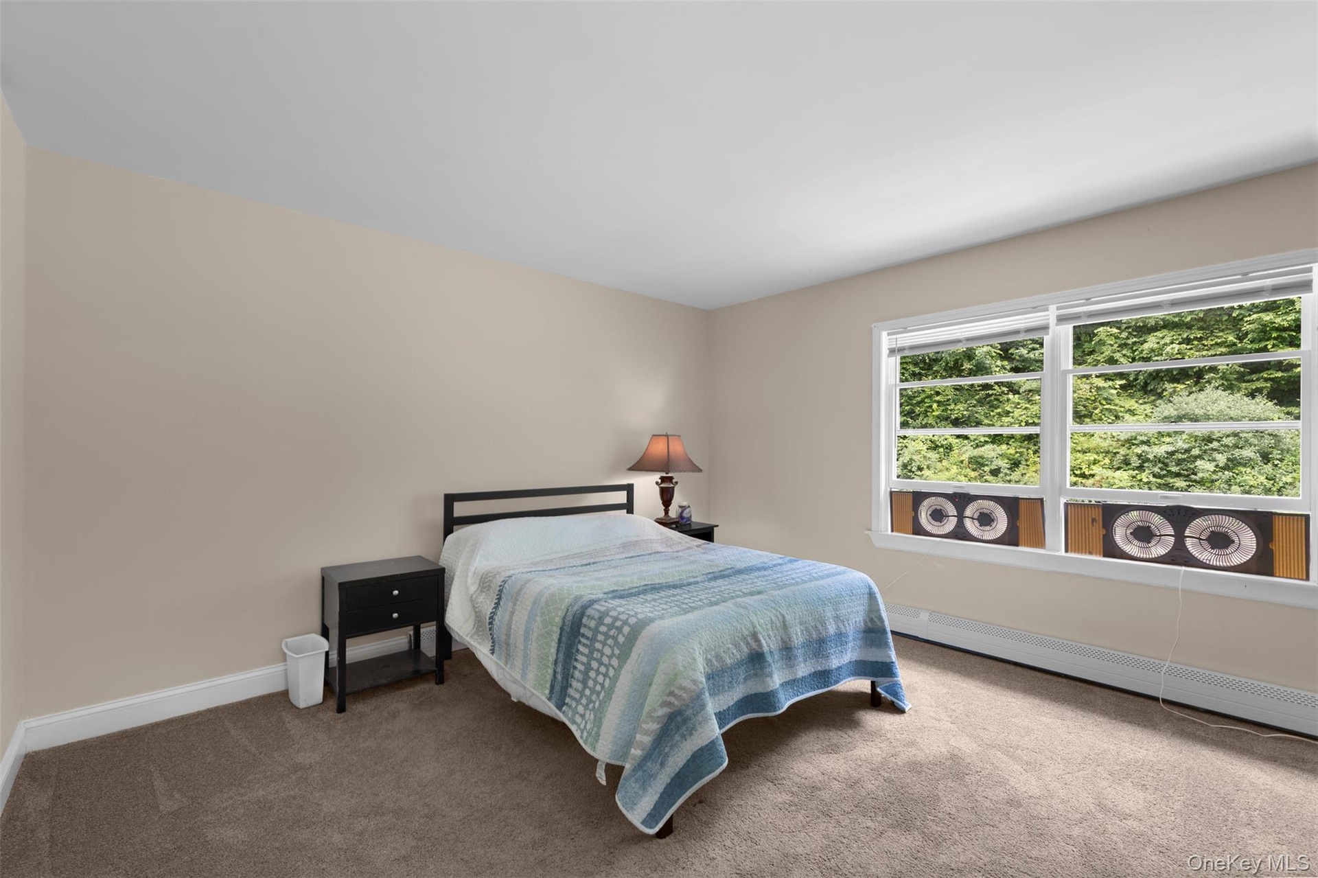 - Carpeted bedroom featuring a baseboard radiator and baseboards