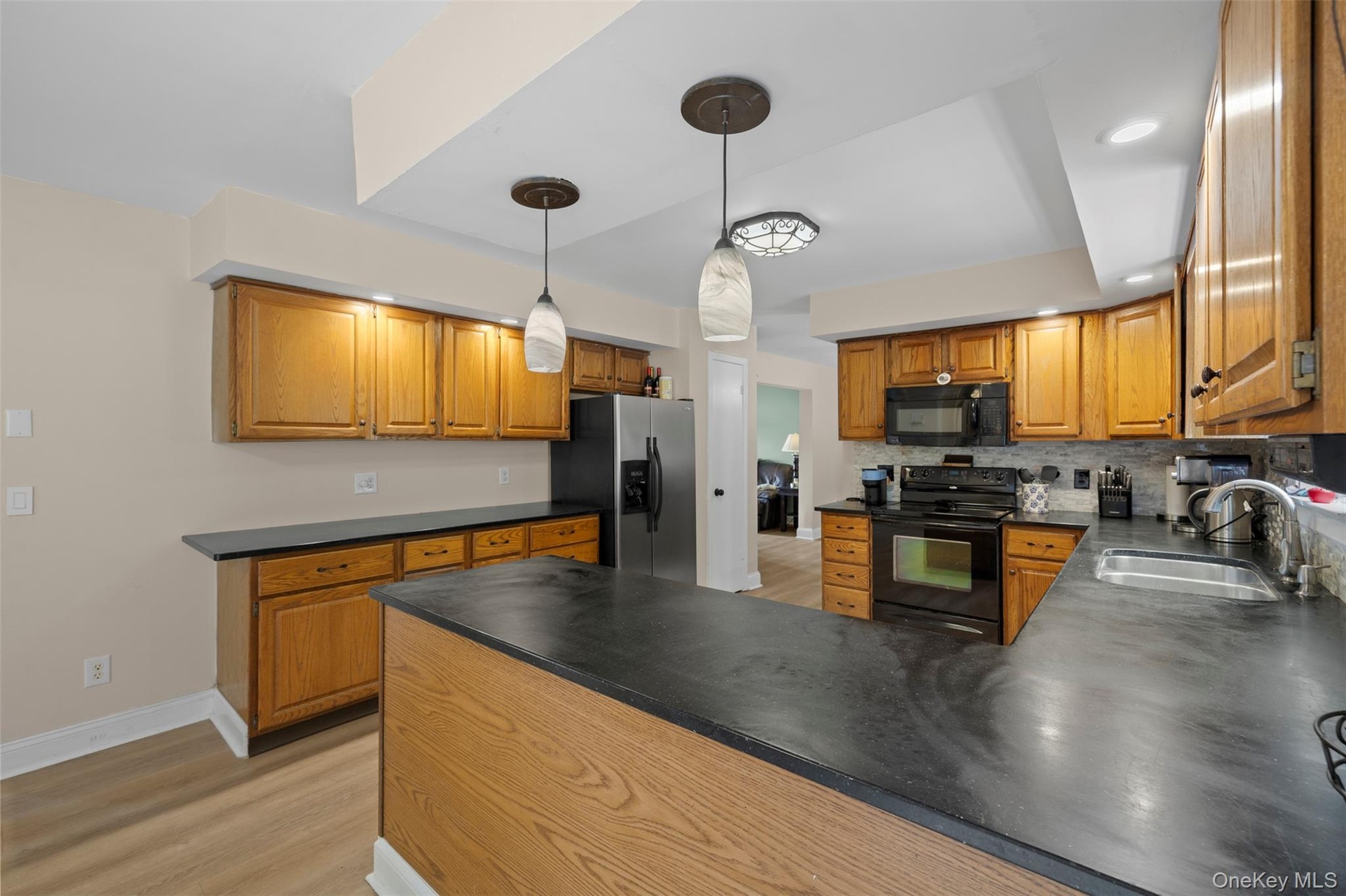 - Kitchen featuring black appliances, dark countertops, brown cabinetry, light wood finished floors, and hanging light fixtures