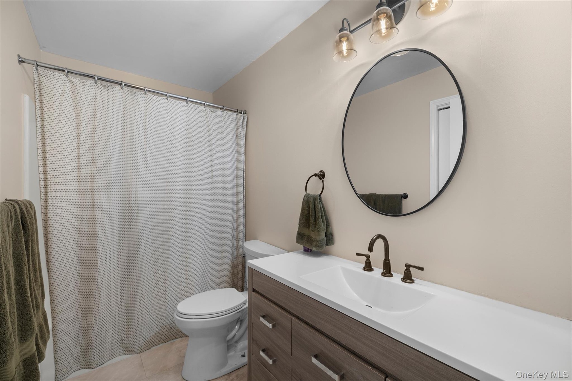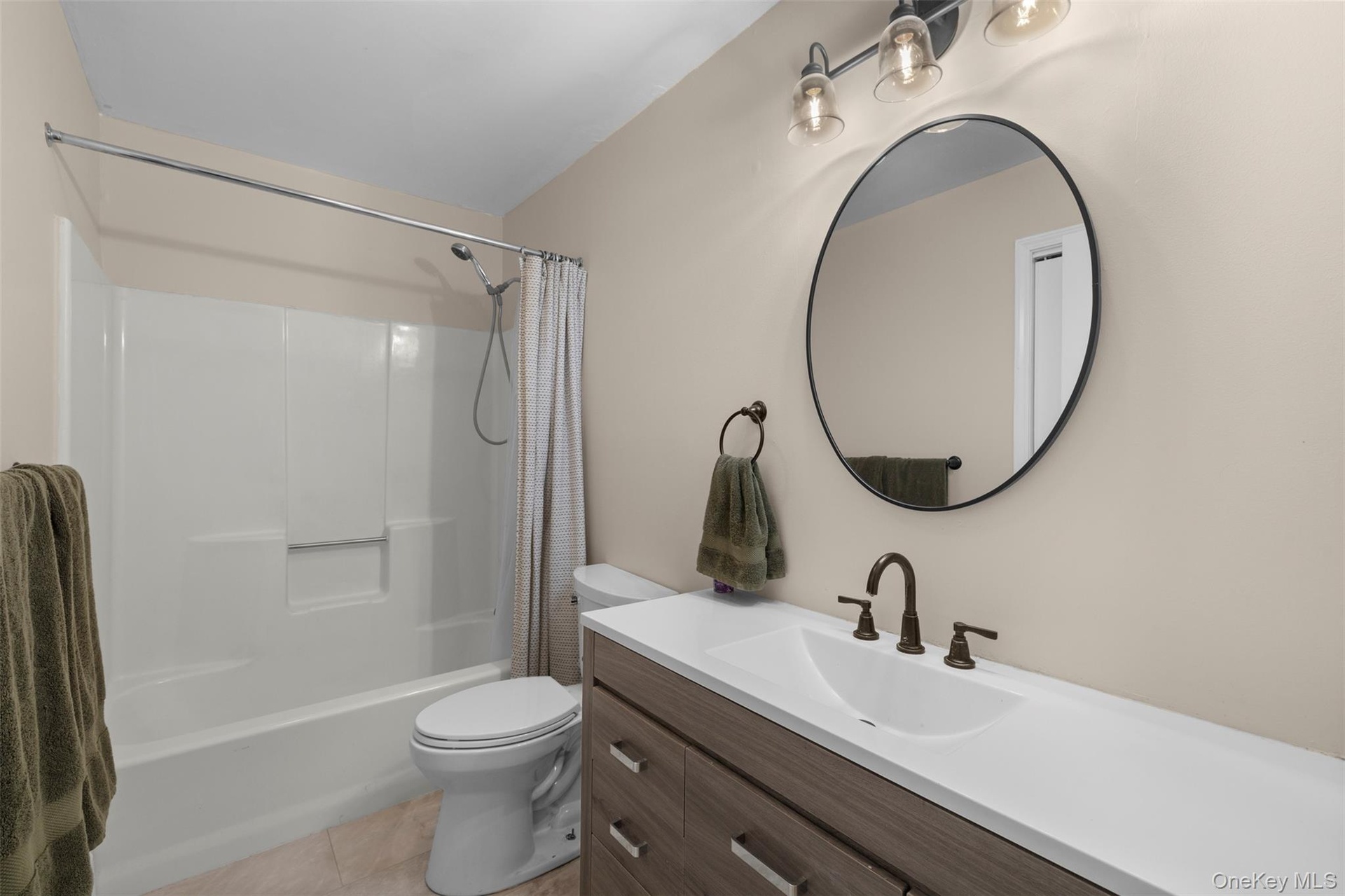 - Full bath with vanity, tile patterned flooring, and a shower with curtain