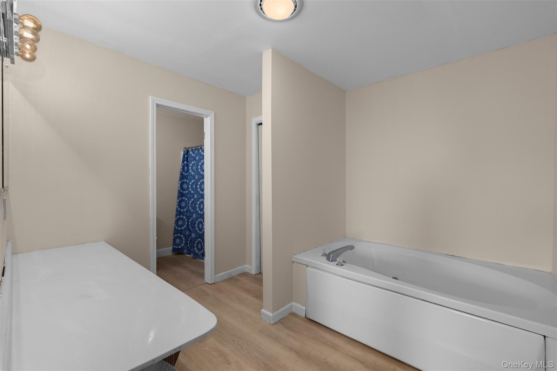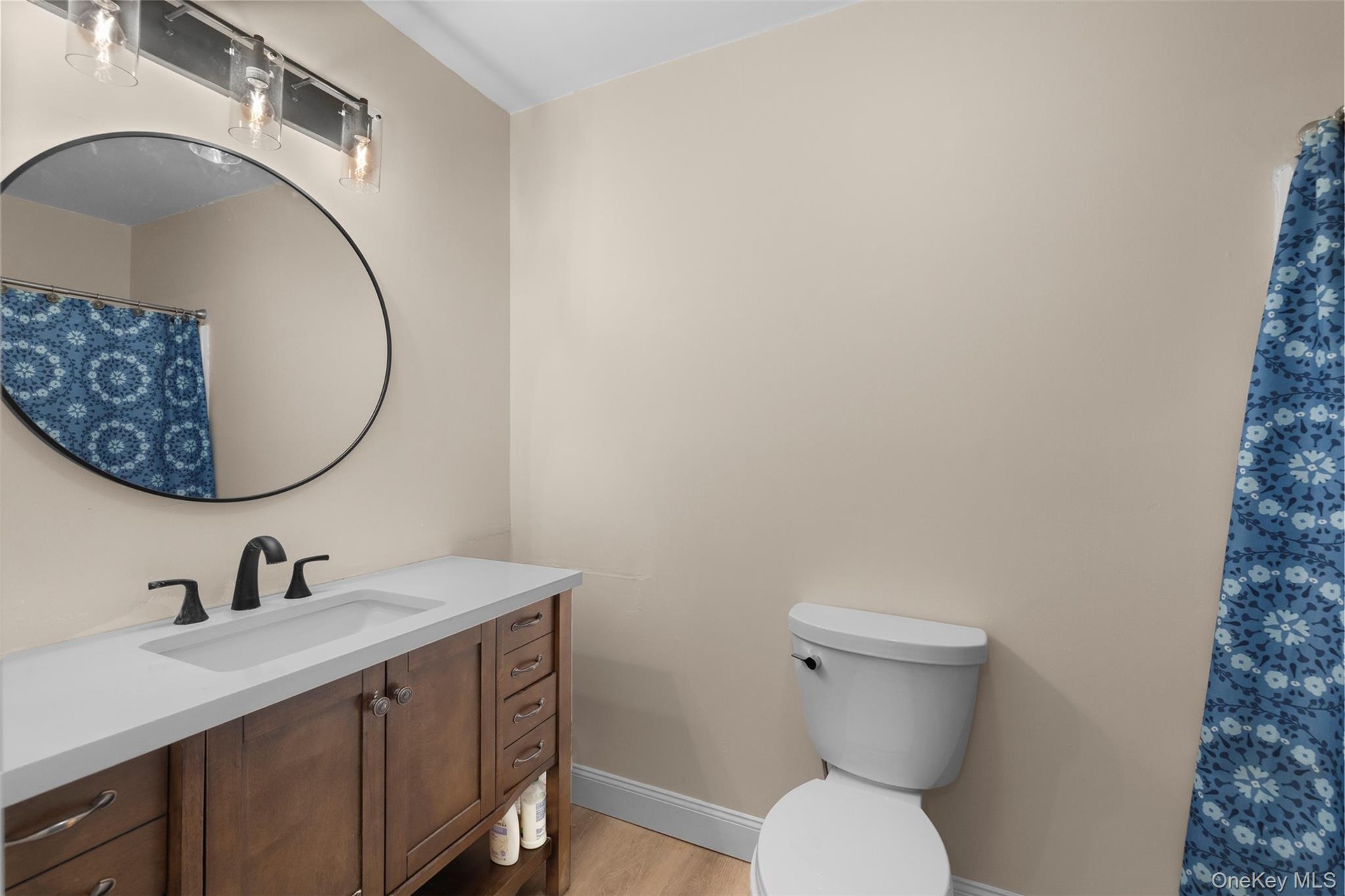 - Full bathroom with vanity, wood finished floors, and a shower with curtain