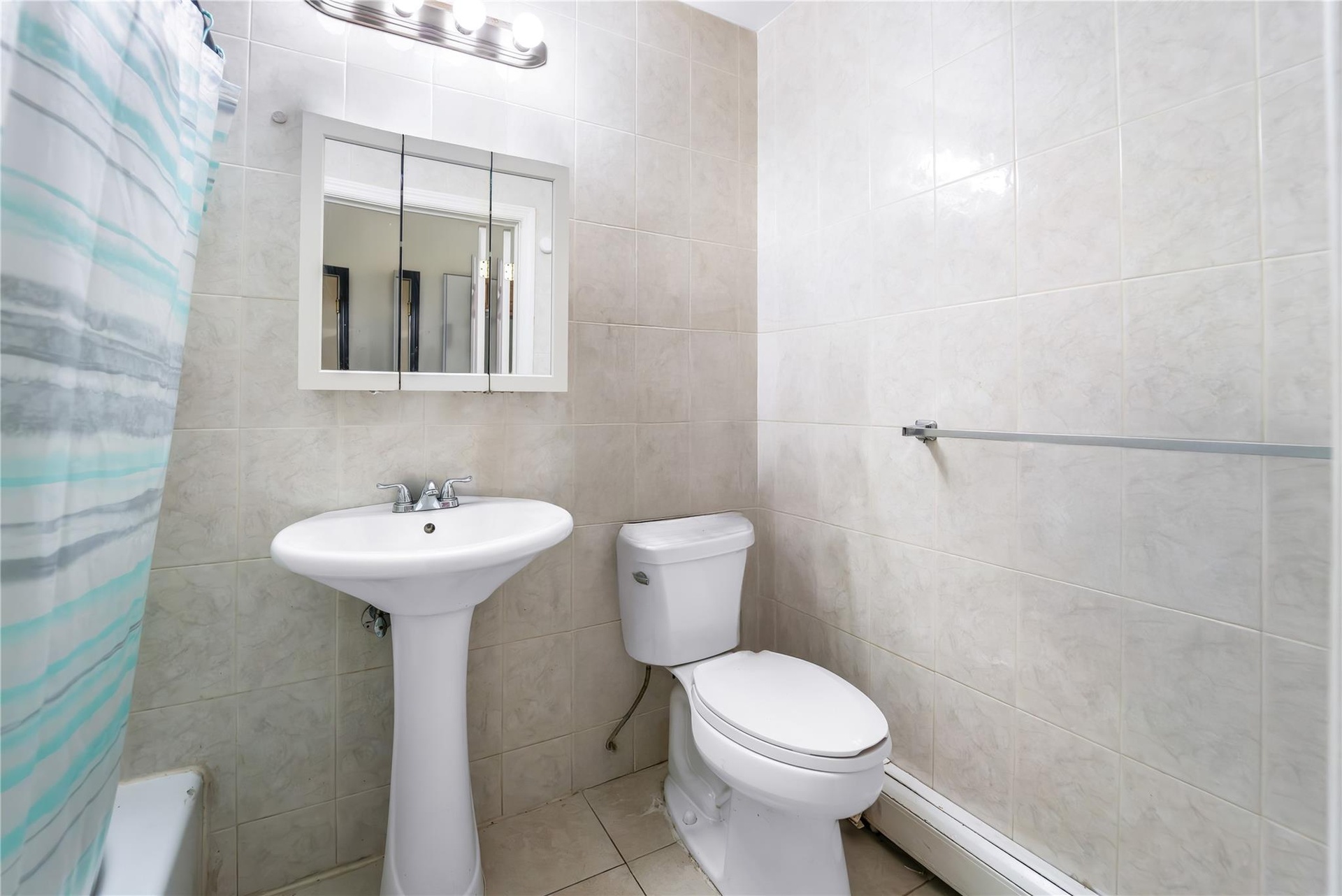 - Bathroom featuring tile walls, tile patterned flooring, a baseboard radiator, and shower / bath combo with shower curtain