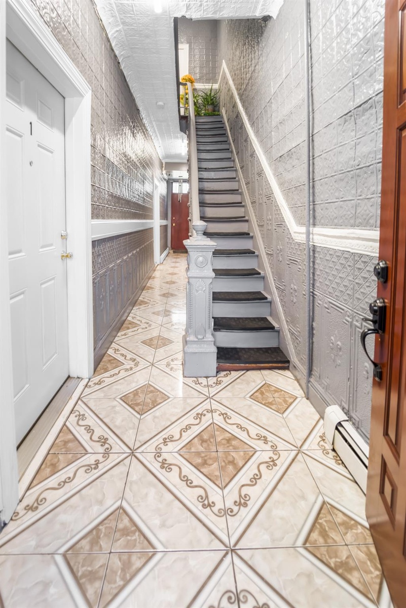 - Entrance foyer with a baseboard radiator, light tile patterned floors, and stairs