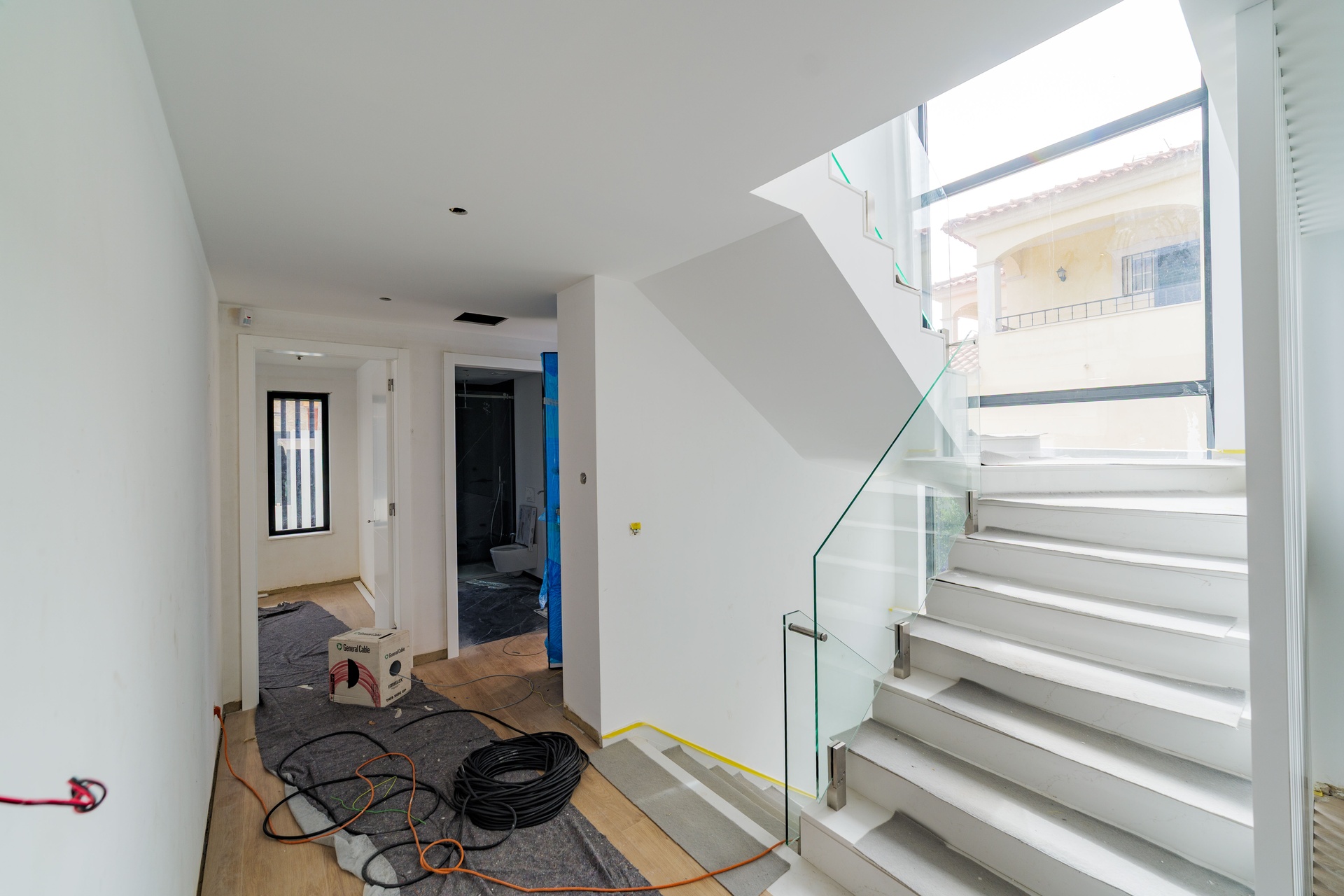 Upstairs, the first floor is dedicated to three en-suite bedrooms, each with built-in wardrobes, including a master suite with a walk-in closet and private balcony. The high-quality finishes include underfloor heating via heat pump, ducted air conditioning in all rooms, a home automation system, video surveillance, and premium double-glazed window frames designed for maximum thermal and acoustic comfort.