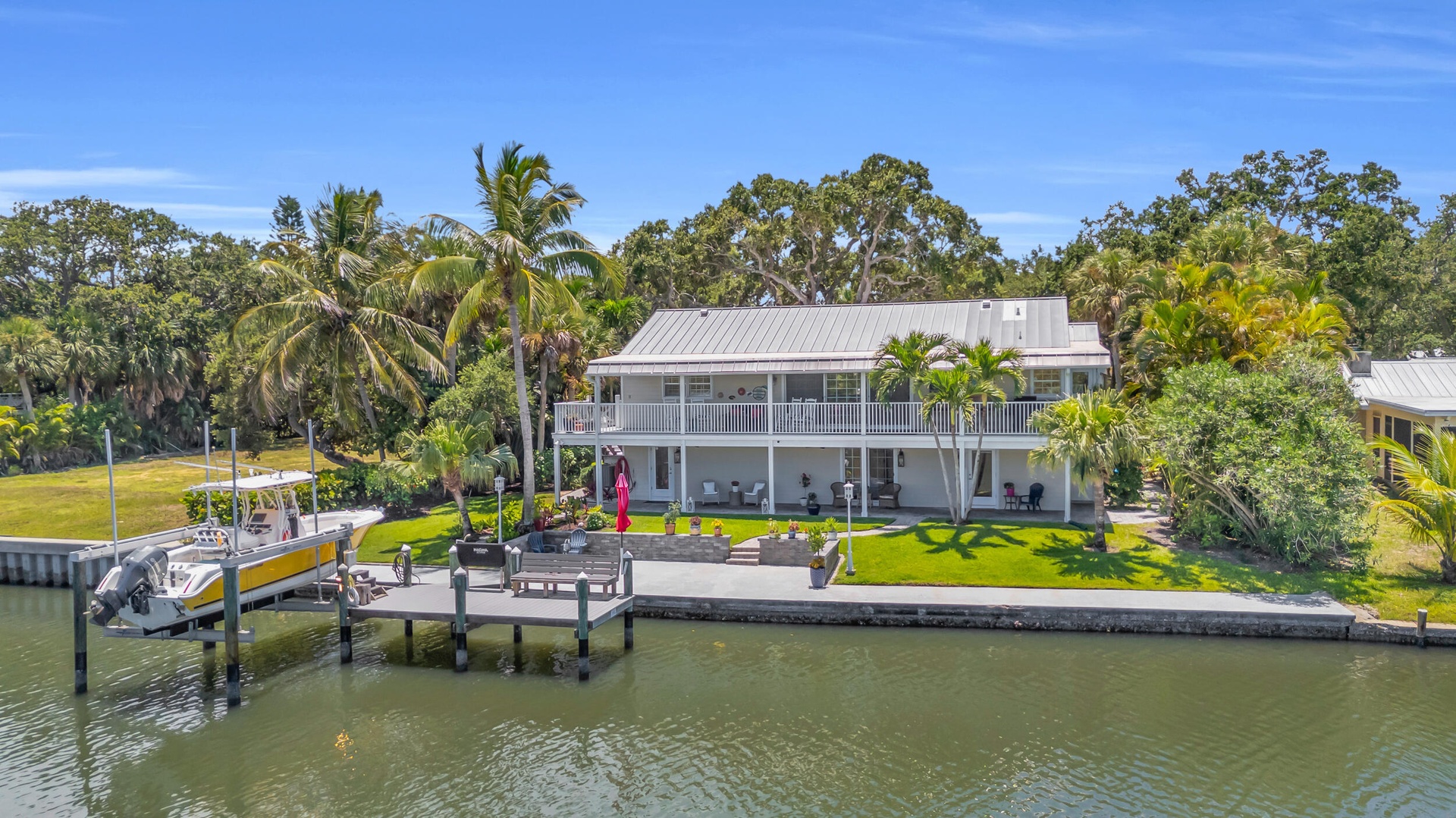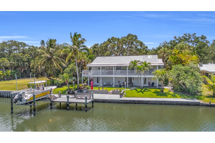 Wake up to daily dolphin & manatee sightings from your backyard at this unique riverfront home, complete with a private dock, 12,000-lb boat lift, and newly refinished seawall! Solid concrete block construction on both levels with coastal finishes, wood and travertine floors & easy roll-down hurricane shutters. Immaculately maintained with an air-conditioned garage, rebuilt well pump, new electrical panels, updated irrigation, and stunning landscaping enhanced by fruit trees and new lighting. Private, peaceful, and just steps from the ELC--perfect for boaters and nature lovers alike! Rmszapprox