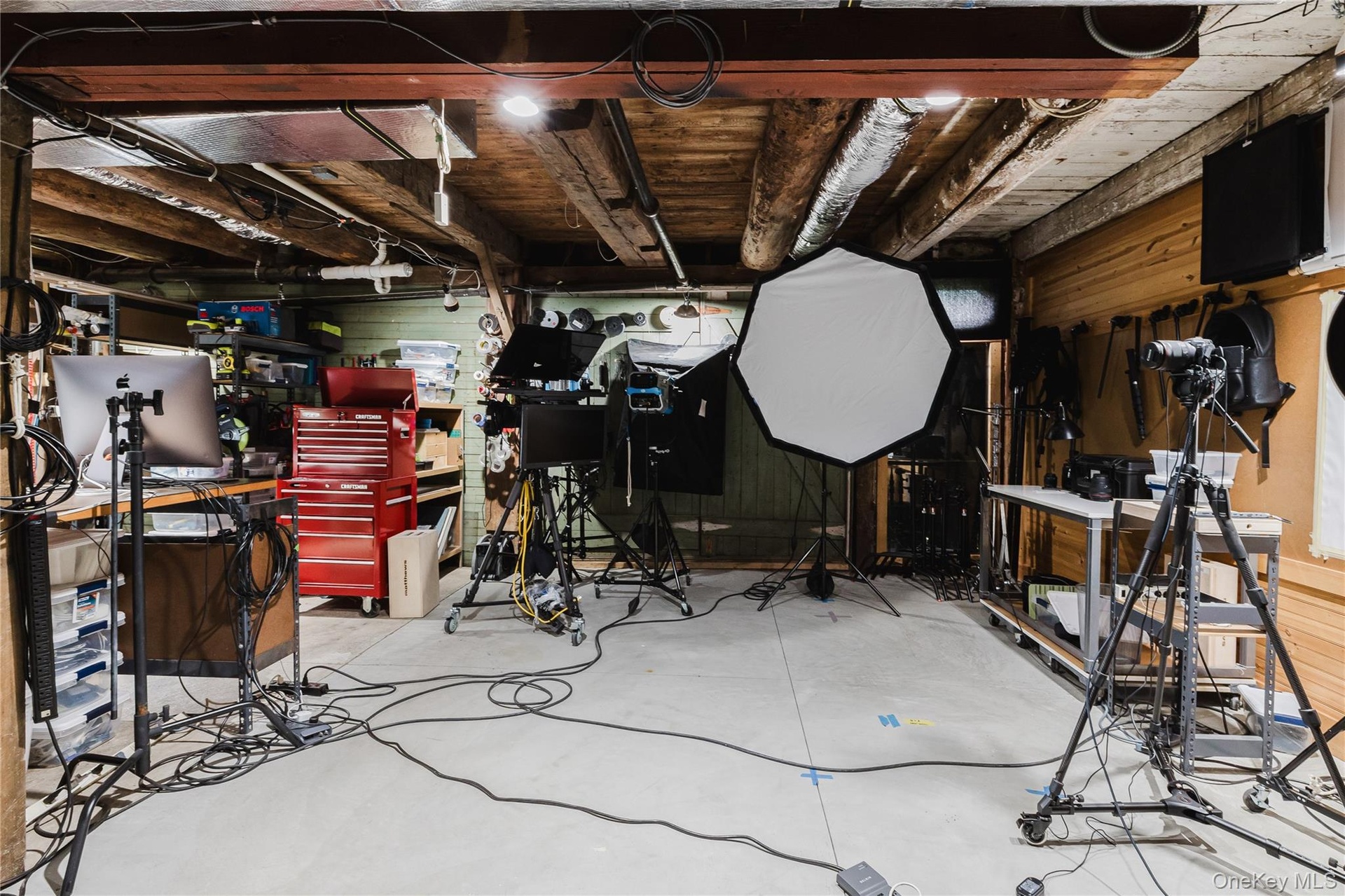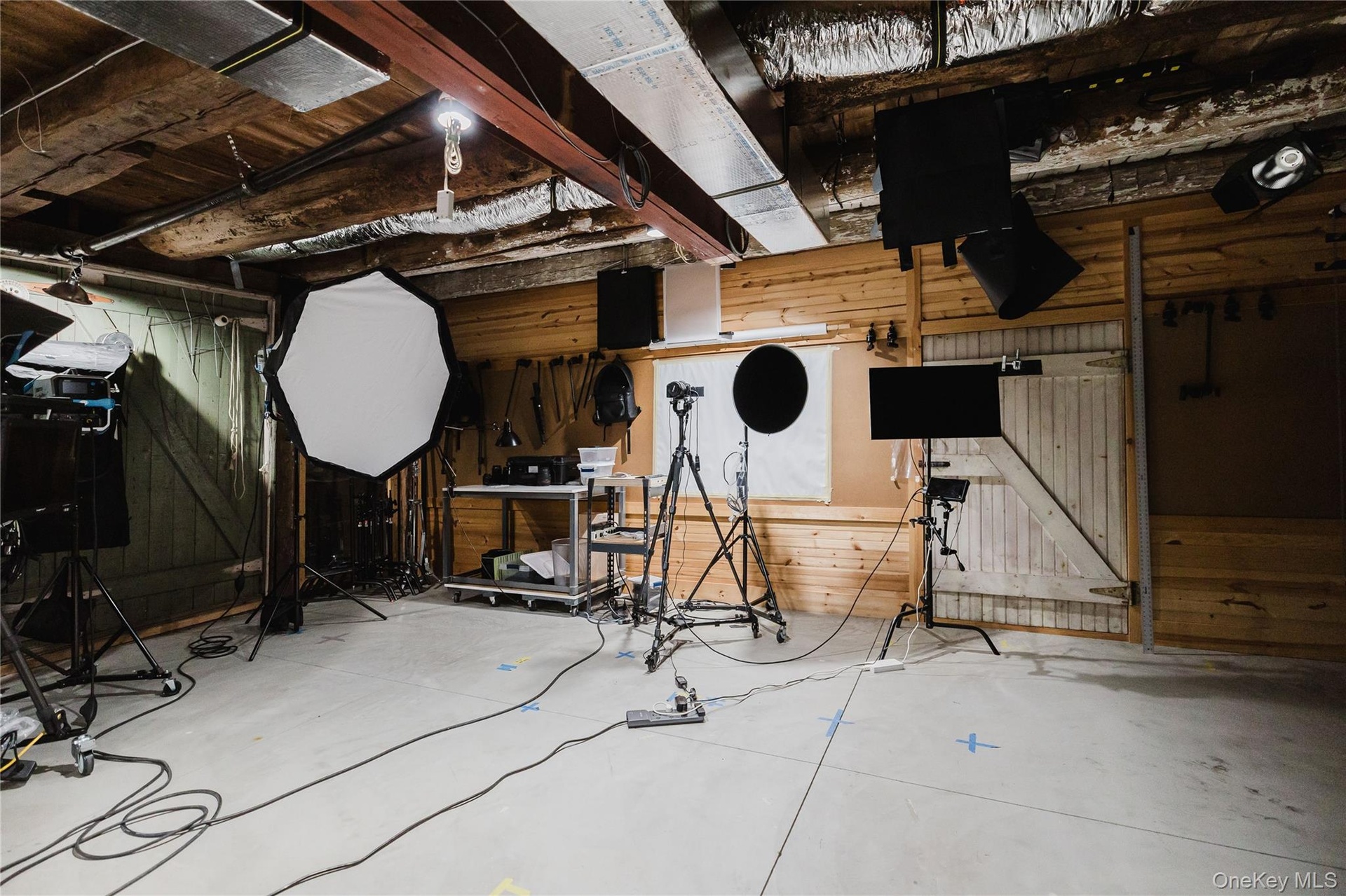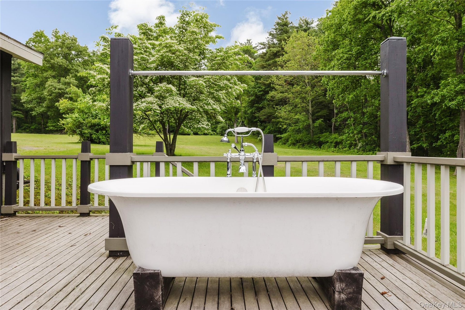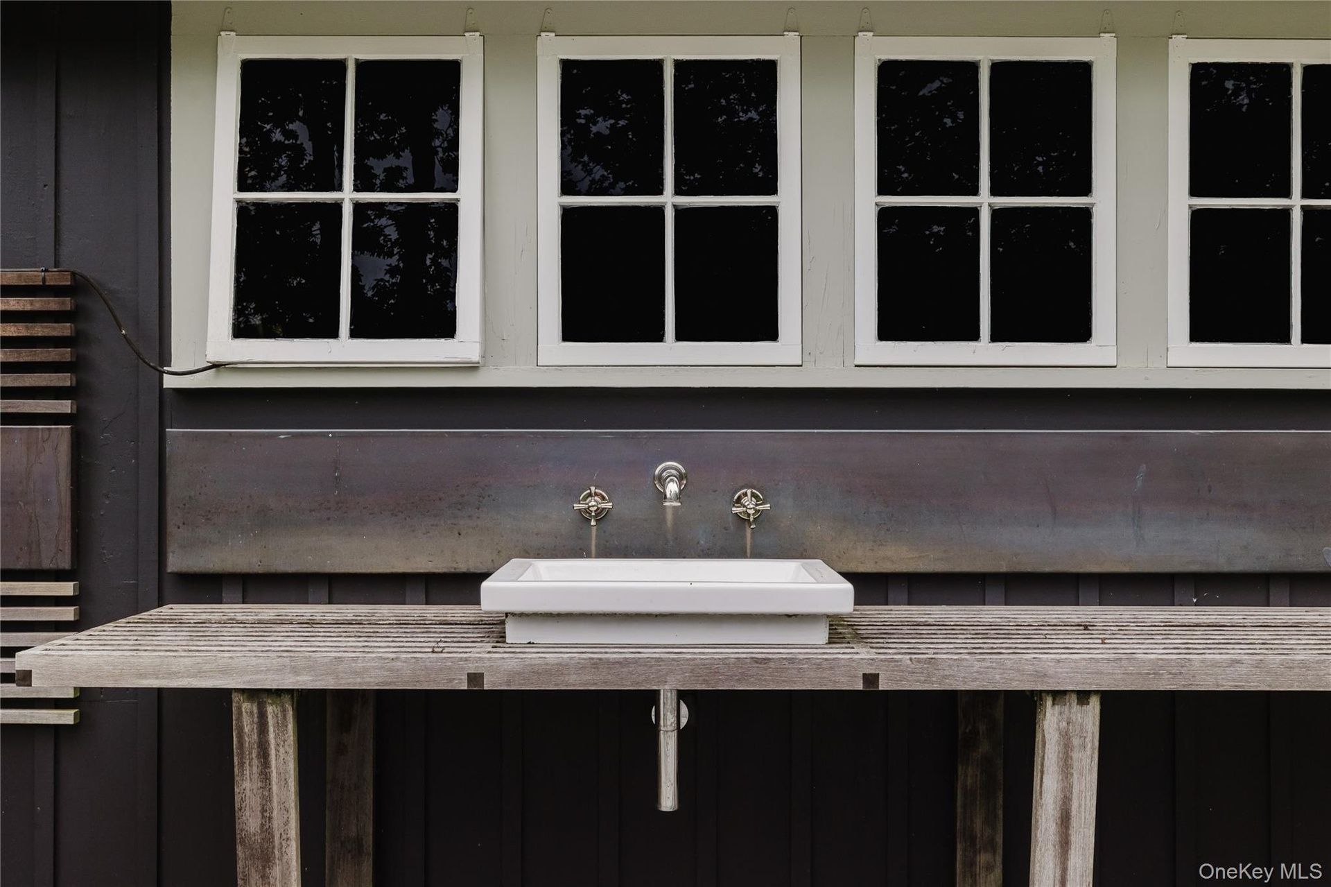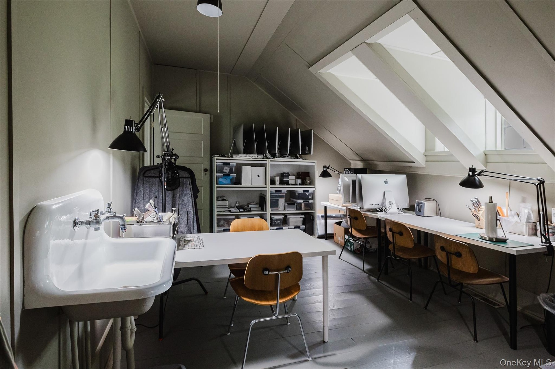 Across the garden sits a fully insulated, historic barn that has been transformed into a large-scale creative studio, complete with a bathroom with a clawfoot tub, kitchenette, updated electrical and HVAC. A detached potting shed offers another versatile space, ideal as a garden studio, writer’s nook, or future guest cottage. It’s connected to an outdoor bath deck that invites restorative soaks beneath the stars with its fireplace, clawfoot tub, and outdoor shower. Next to the house, a carport with EV charging and a full-property generator ensures comfort and continuity year-round.