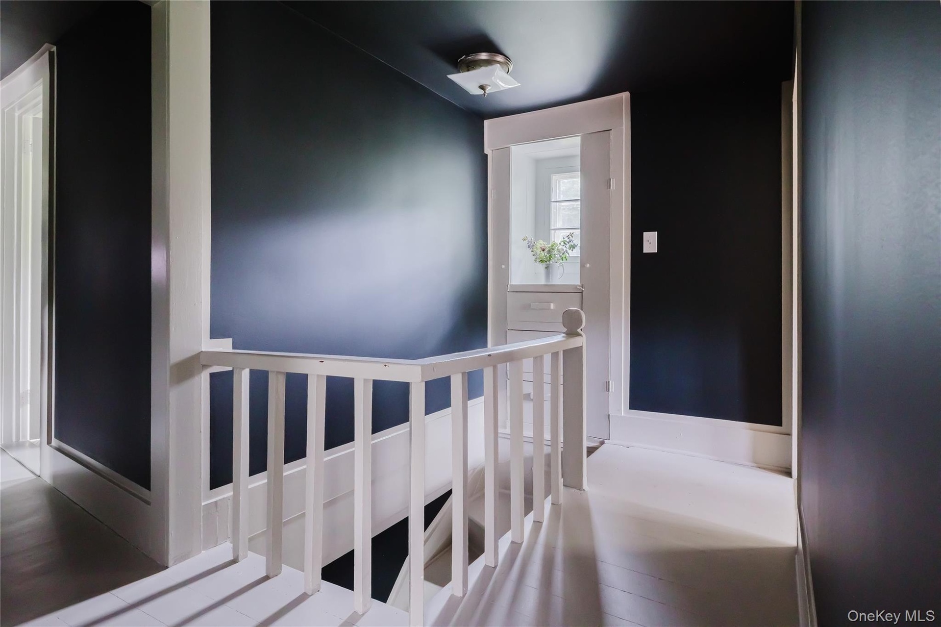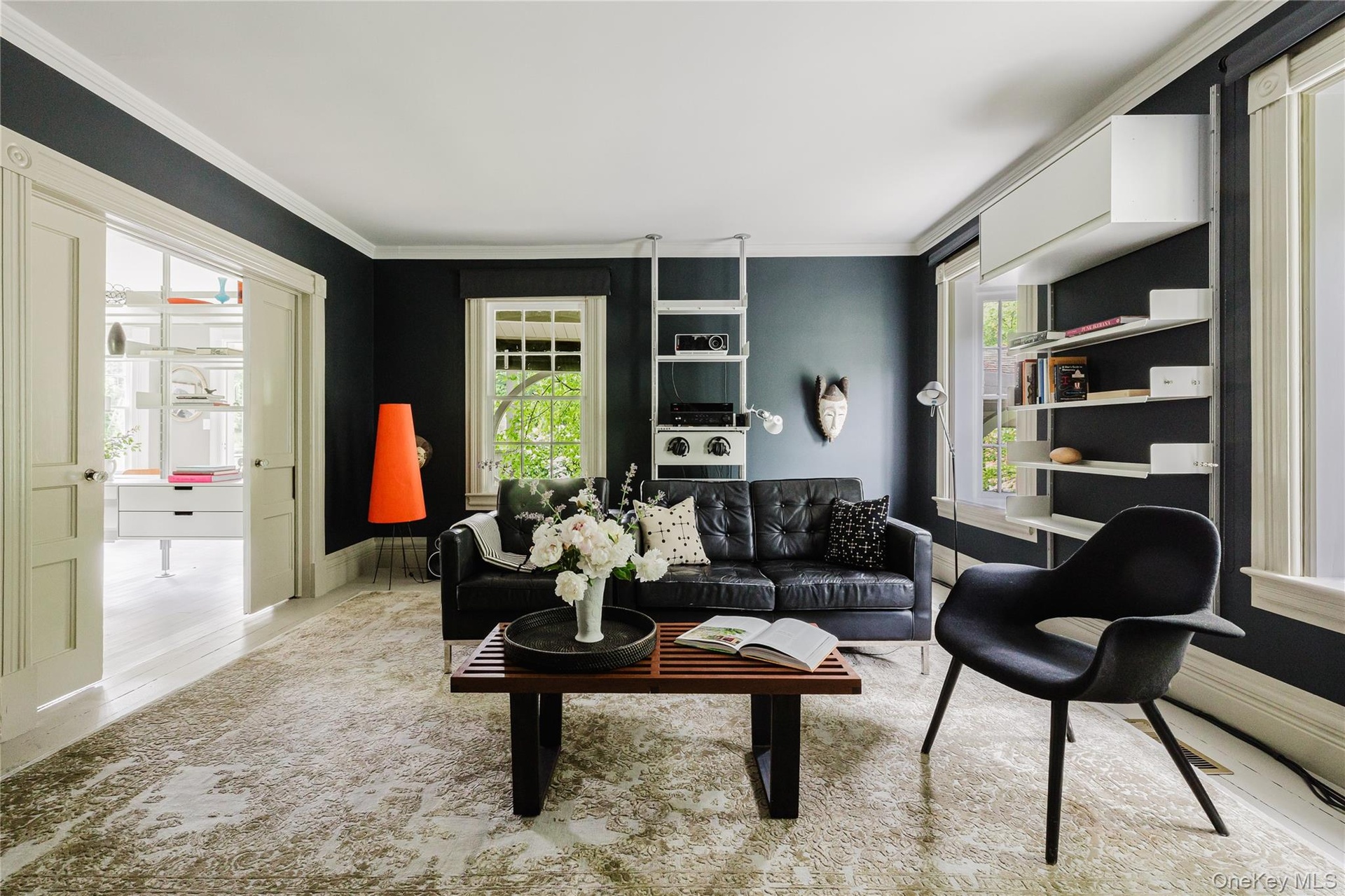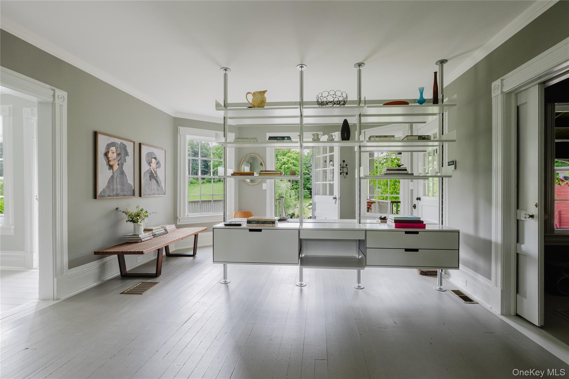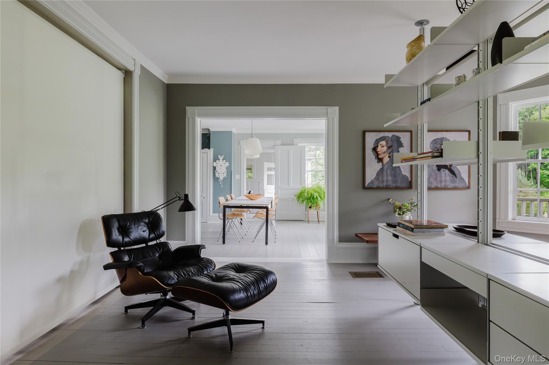 The antique farmhouse offers four bedrooms and two bathrooms across 2,825 square feet, where original details like moldings, wood floors, and Dutch doors preserve its old-world charm. A generous double living room and an office nook outfitted with Vitsoe modular shelving, lead to a bright dining area, kitchen, and direct access to the patios and gardens. The layout encourages an easy indoor-outdoor rhythm, with covered porches, and multiple terraces for lounging, cooking, or gathering. Two staircases rise to the upper-level bedrooms, where the southern exposure fills each room with light, and the attic has been insulated to improve year-round comfort. Throughout the home an intentional color palette lends softness and cohesion. The overall design brings together European sensibility and Hudson Valley character, balancing utility with ease, warmth, and quiet sophistication.