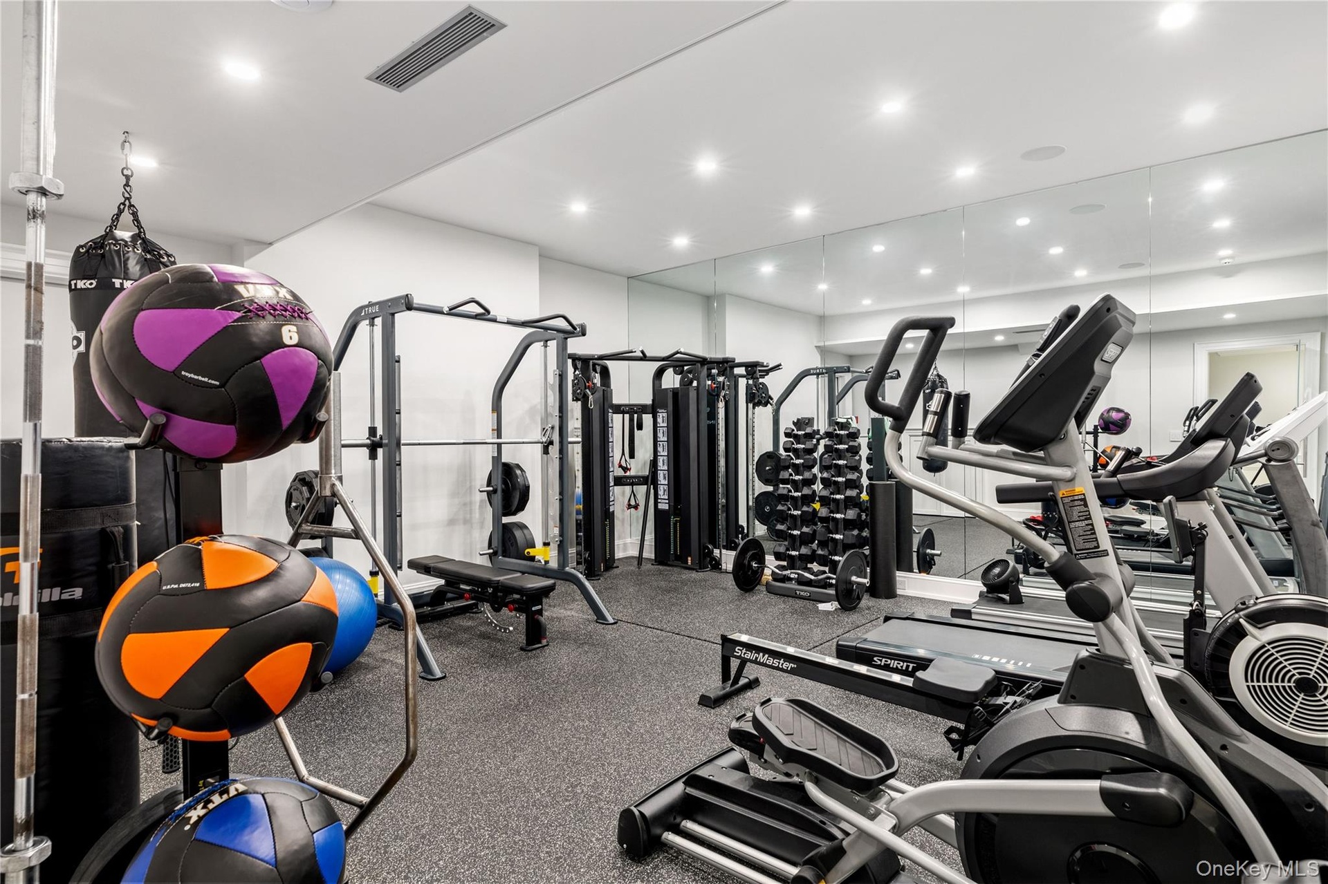 The lower level redefines entertaining with a striking wet bar, wine refrigeration, poker room, media lounge with marble fireplace, state-of-the-art fitness center, and a dedicated steam shower.