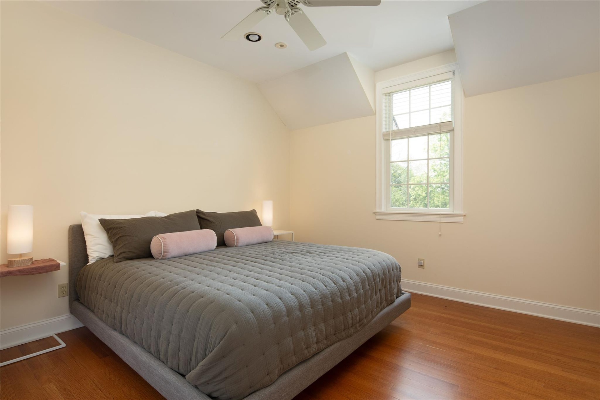 - Bedroom featuring wood finished floors, a ceiling fan, and lofted ceiling