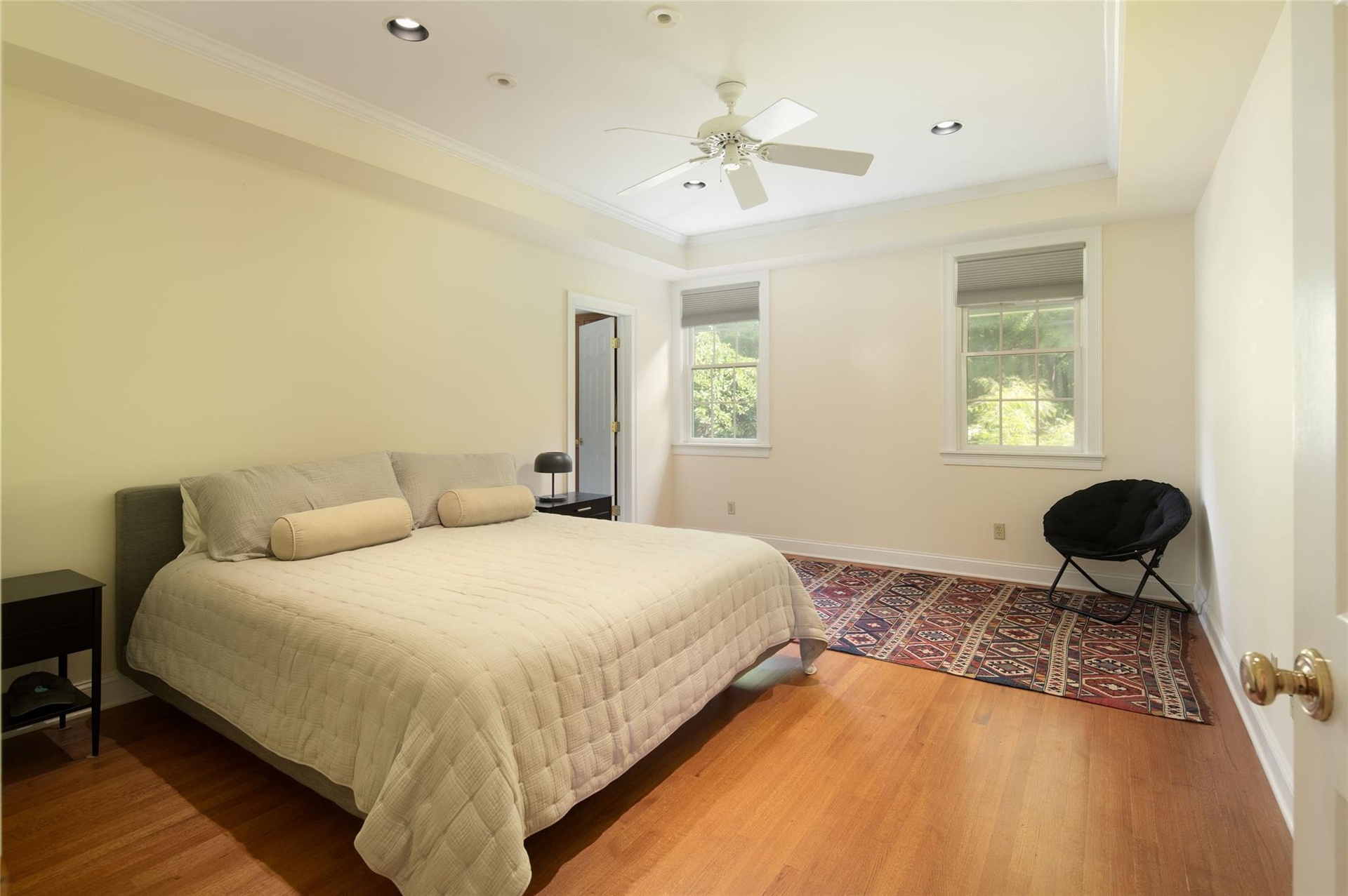 - Spacious Bedroom on main floor with wood finished floors, multiple windows, crown molding, recessed lighting, and ceiling fan