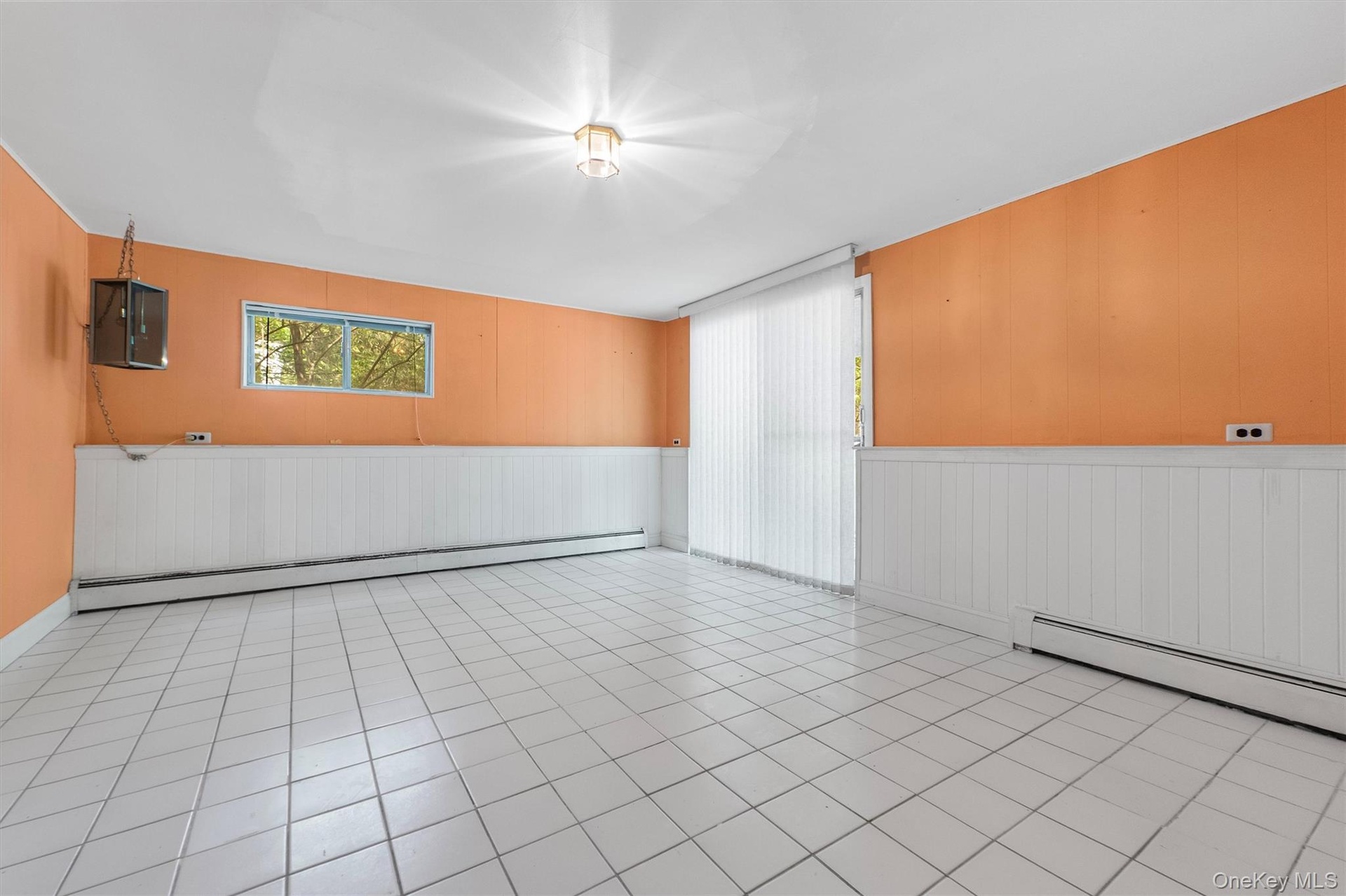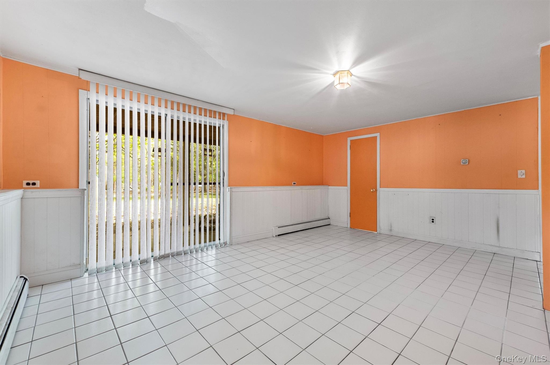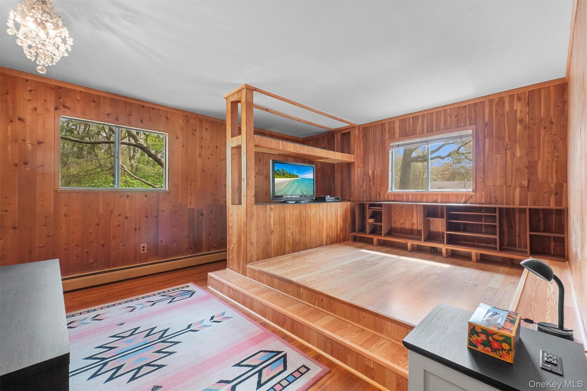 - Living area with a fireplace, lofted ceiling, wood-type flooring, and a baseboard radiator