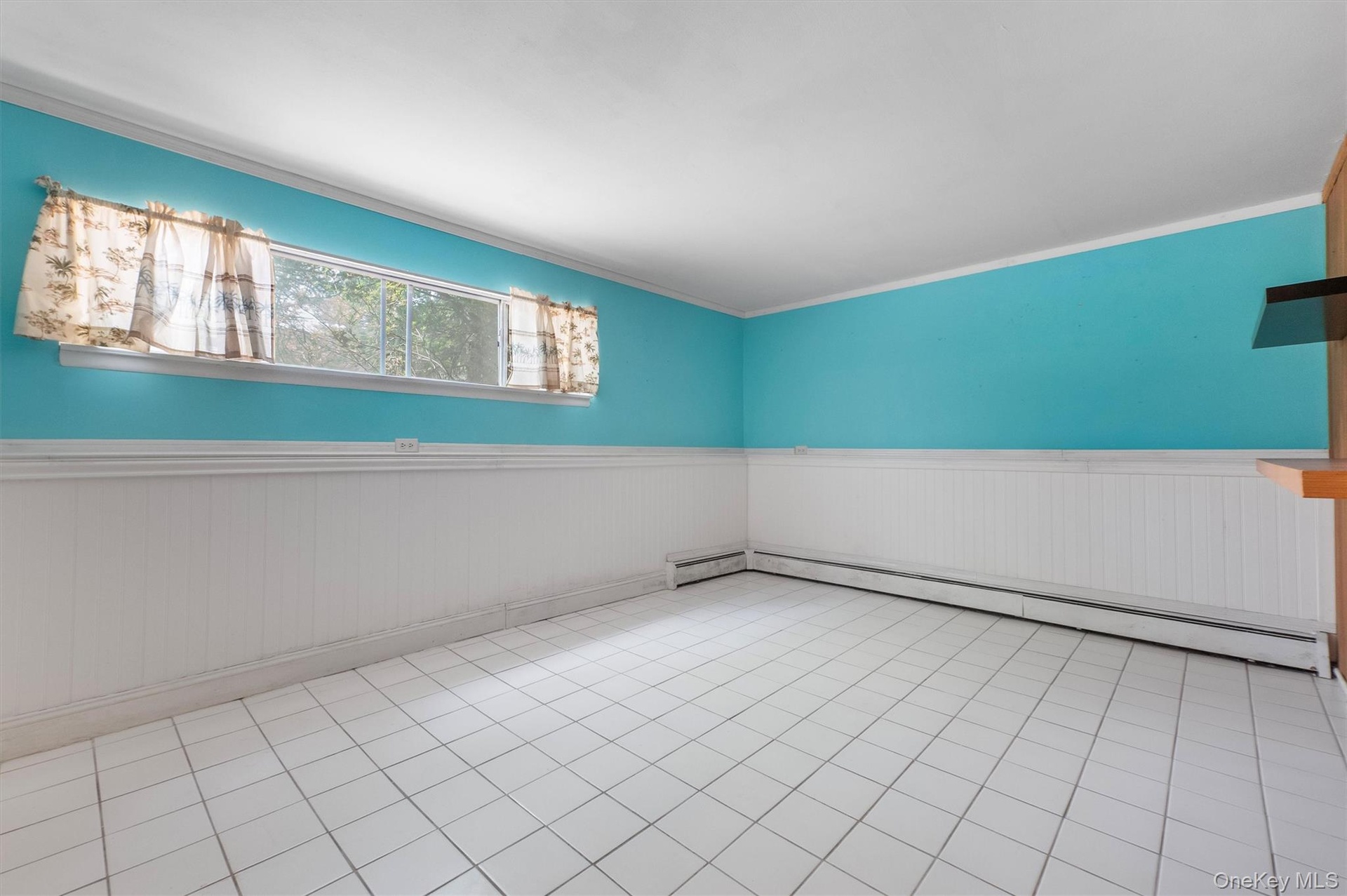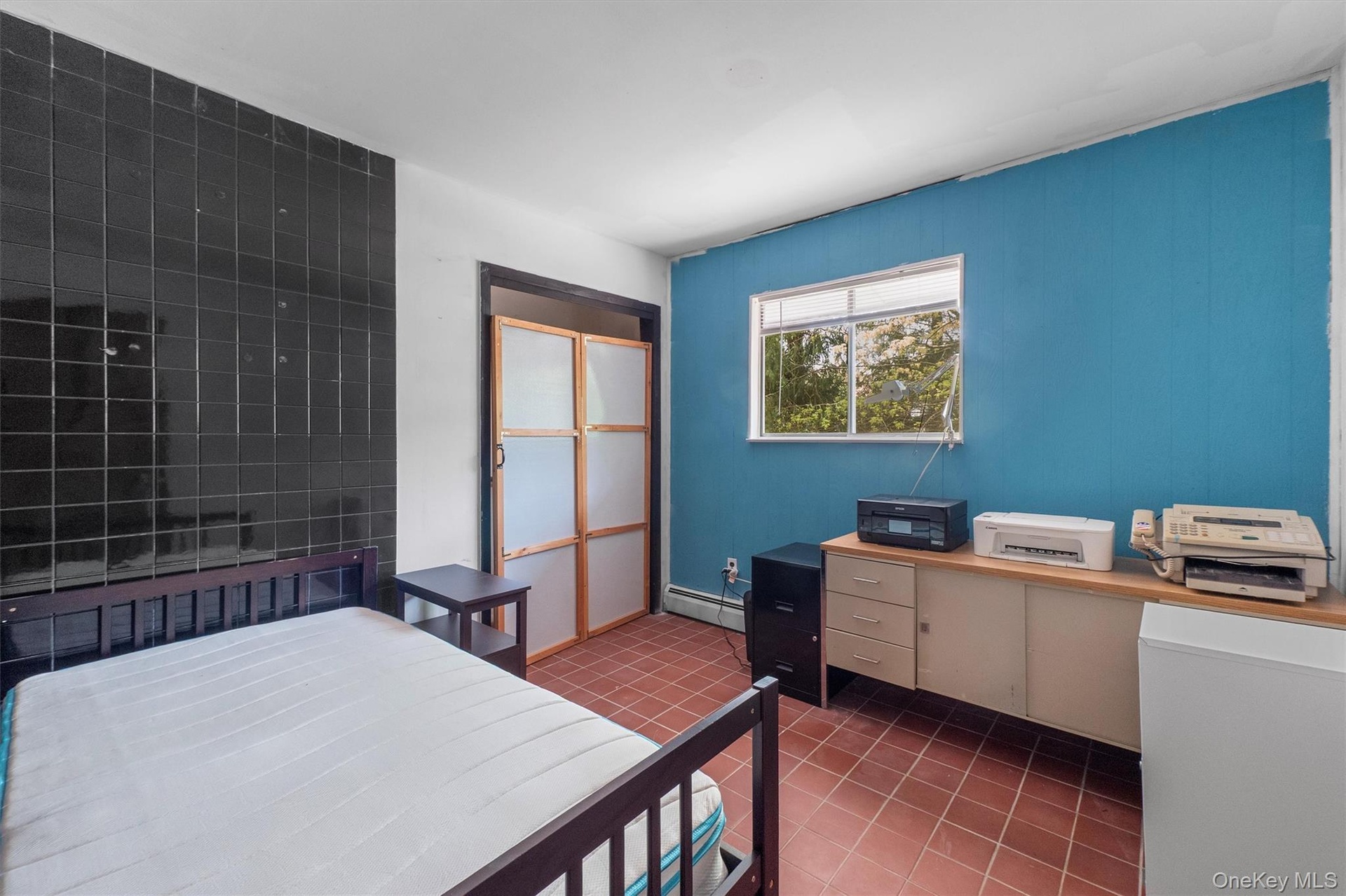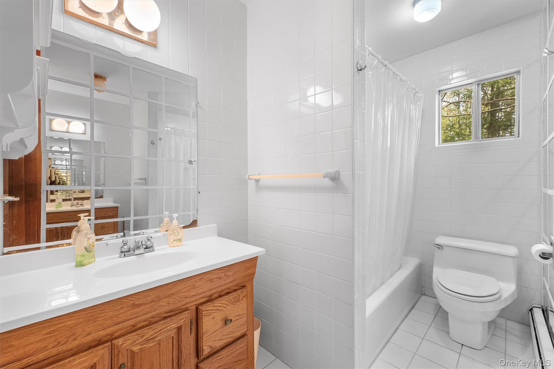 - Living area with a fireplace, lofted ceiling, wood-type flooring, and a baseboard radiator