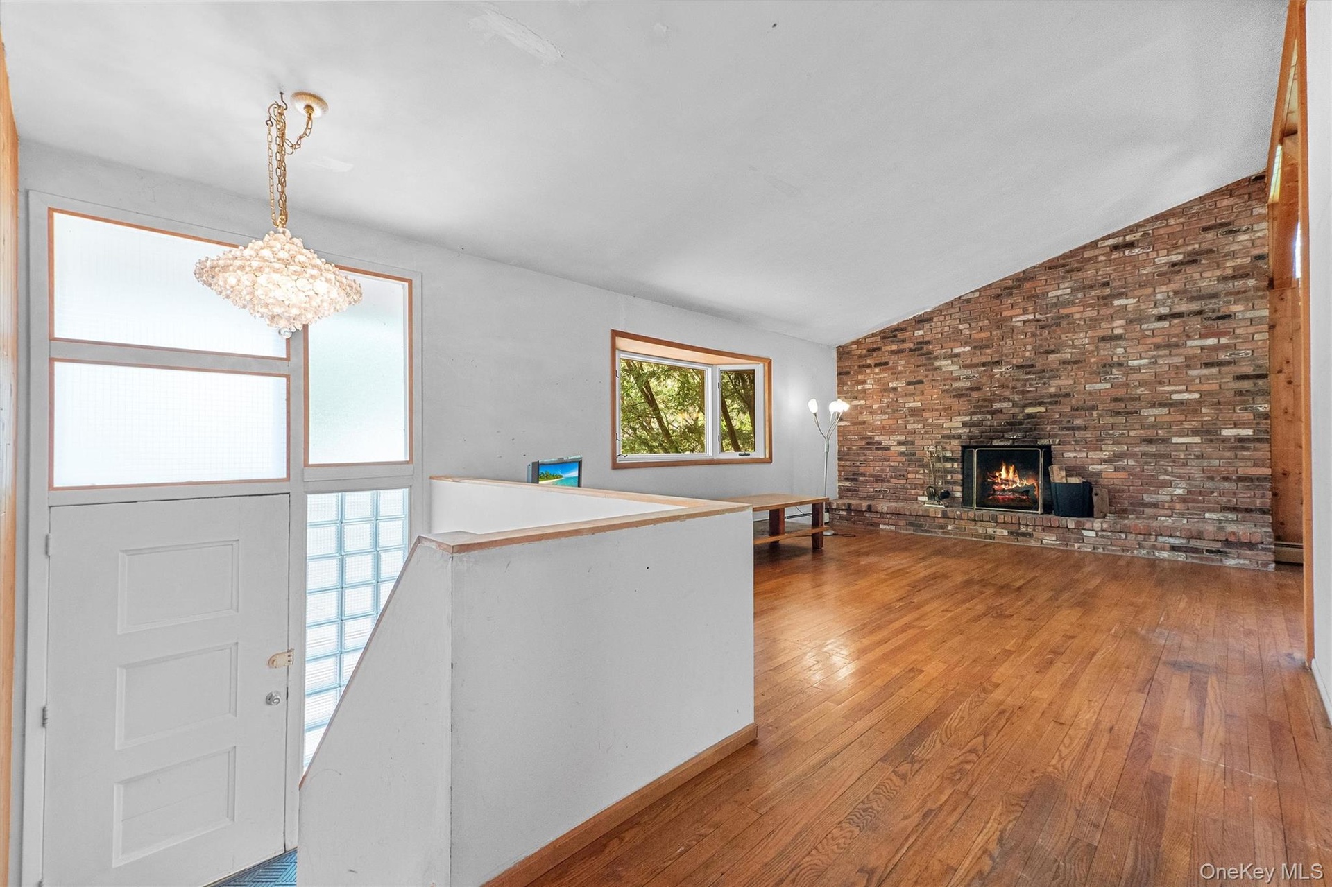 - Foyer with a notable chandelier, a fireplace, wood-type flooring, and vaulted ceiling
