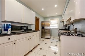 - Kitchen with stainless steel fridge, dark countertops, white cabinetry, and recessed lighting