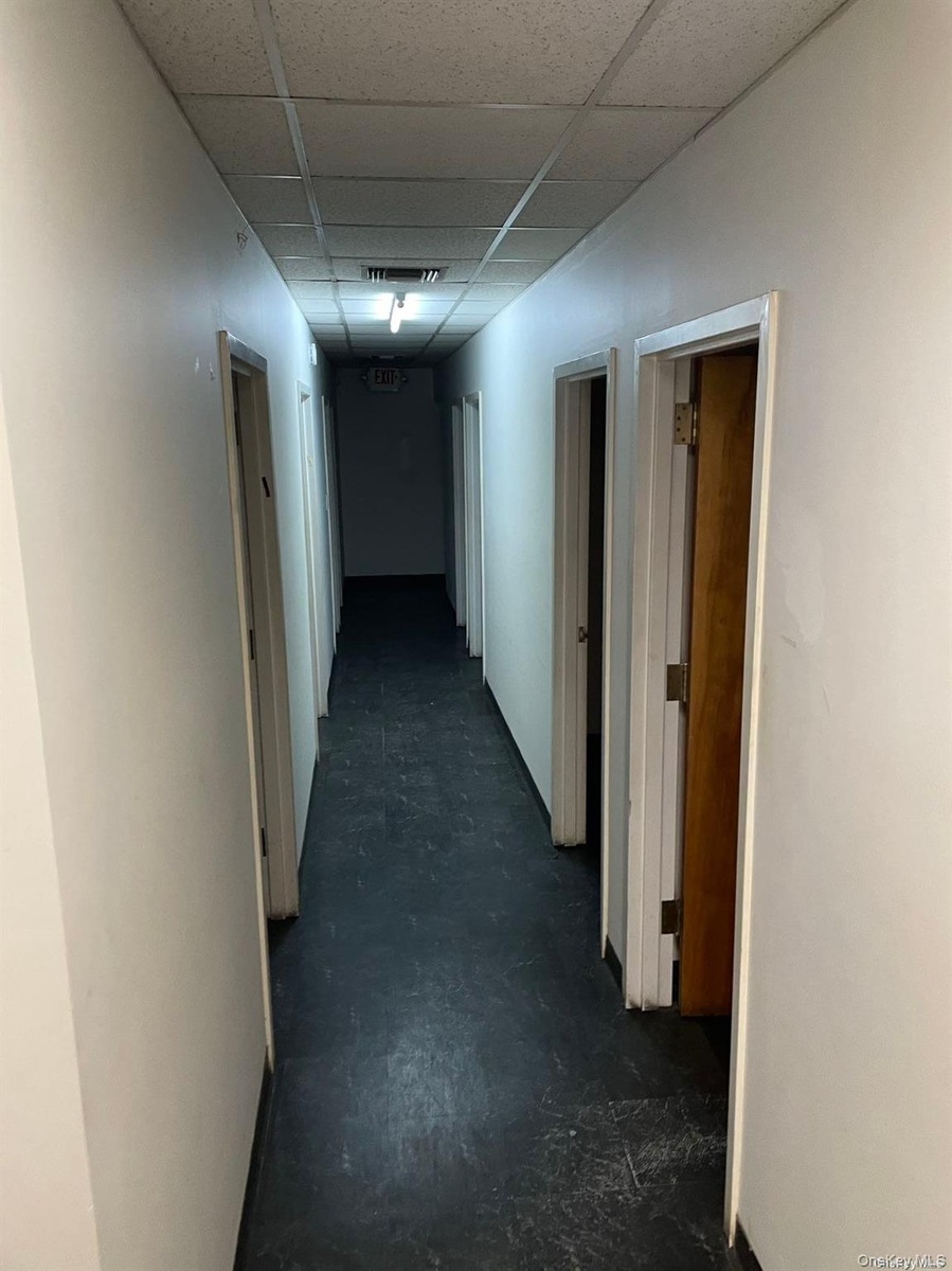 - Hallway featuring concrete floors and a drop ceiling