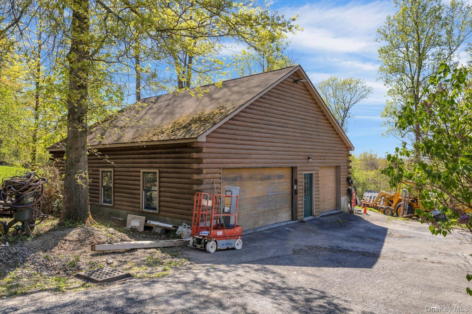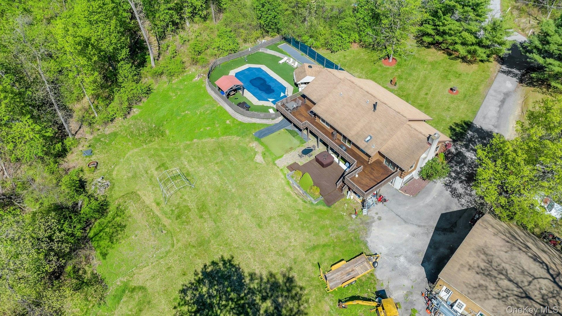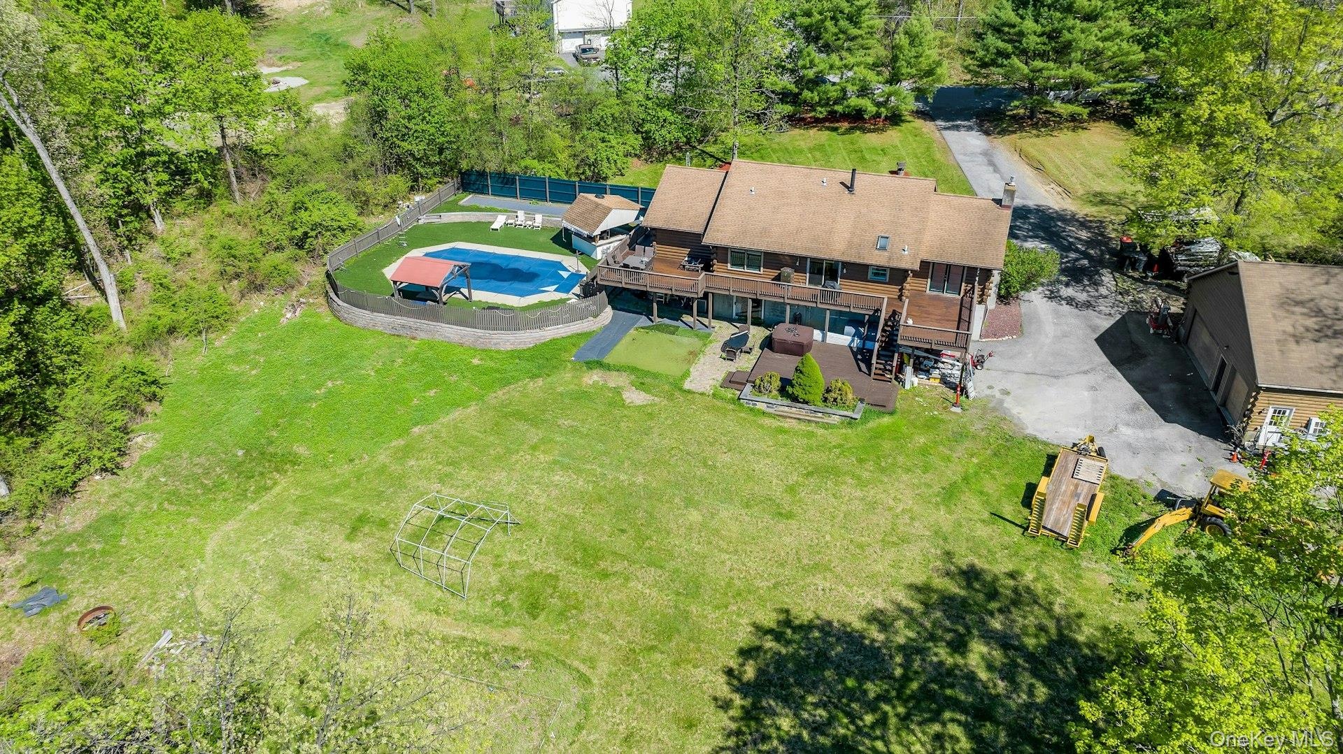 Don't miss this incredible opportunity to live the vacation lifestyle every day. This unique Original Lincoln Log cabin offers a seamless blend of rustic charm and modern updates, set on three private acres with stunning mountainside views. The heart of the home is a beautifully updated open kitchen featuring an island, breakfast bar, two pantry closets, and direct access to the expansive full length deck-perfect for indoor-outdoor living. A separate dining area and a soaring cathedral-ceiling family room with a striking stone fireplace create a warm and inviting atmosphere for entertaining and everyday living. The main level includes two spacious bedrooms, an updated bath, and a private primary suite with a fully renovated ensuite bath and direct access to the deck. The lower level offers even more space to spread out and enjoy, with a large entertainment room that opens to the backyard, a full bath, a generous laundry area with built-in cabinetry, an ice maker and a private office with sliding glass doors. Step outside into your personal outdoor oasis featuring a built-in pool, hot tub, full bar, putting green, bocce ball court and horseshoe area - designed for year-round enjoyment. A massive detached 35' x 36' garage with loft space adds unmatched storage and versatility. This property is truly one-of-a-kind retreat designed for comfort, entertainment and unforgettable memories.