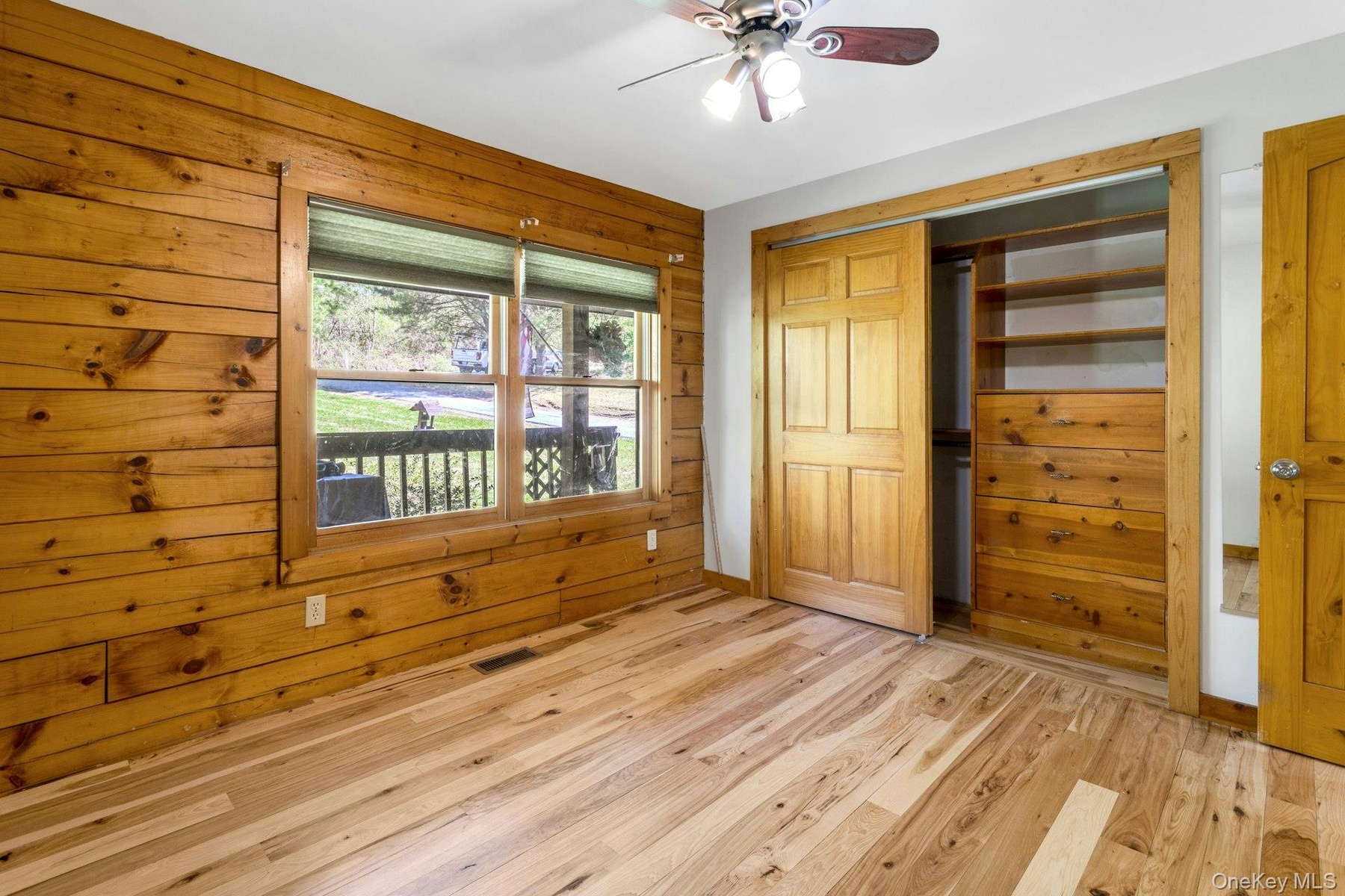 - Unfurnished bedroom featuring wood walls, a closet, visible vents, light wood finished floors, and a ceiling fan