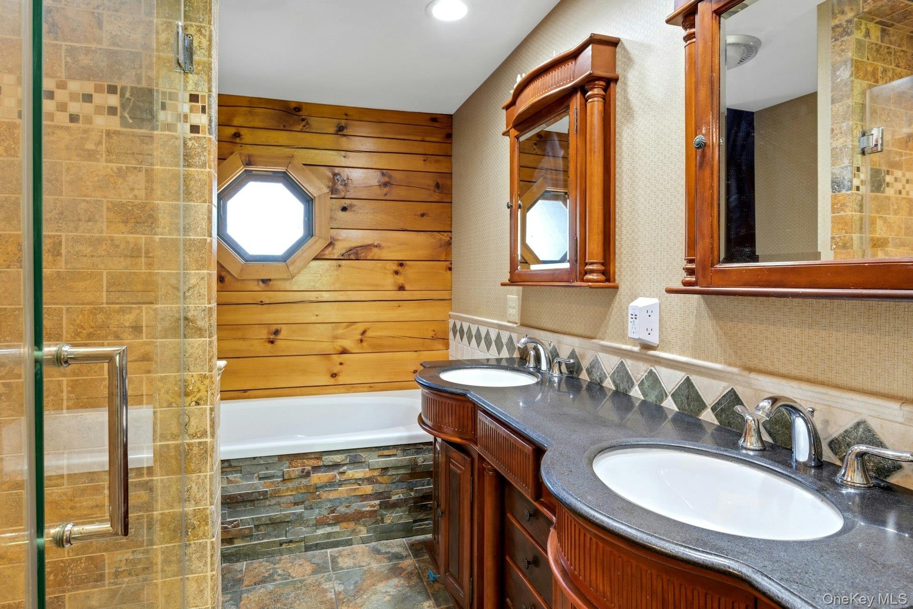 - Bathroom featuring tiled shower, double vanity, a sink, and a washtub