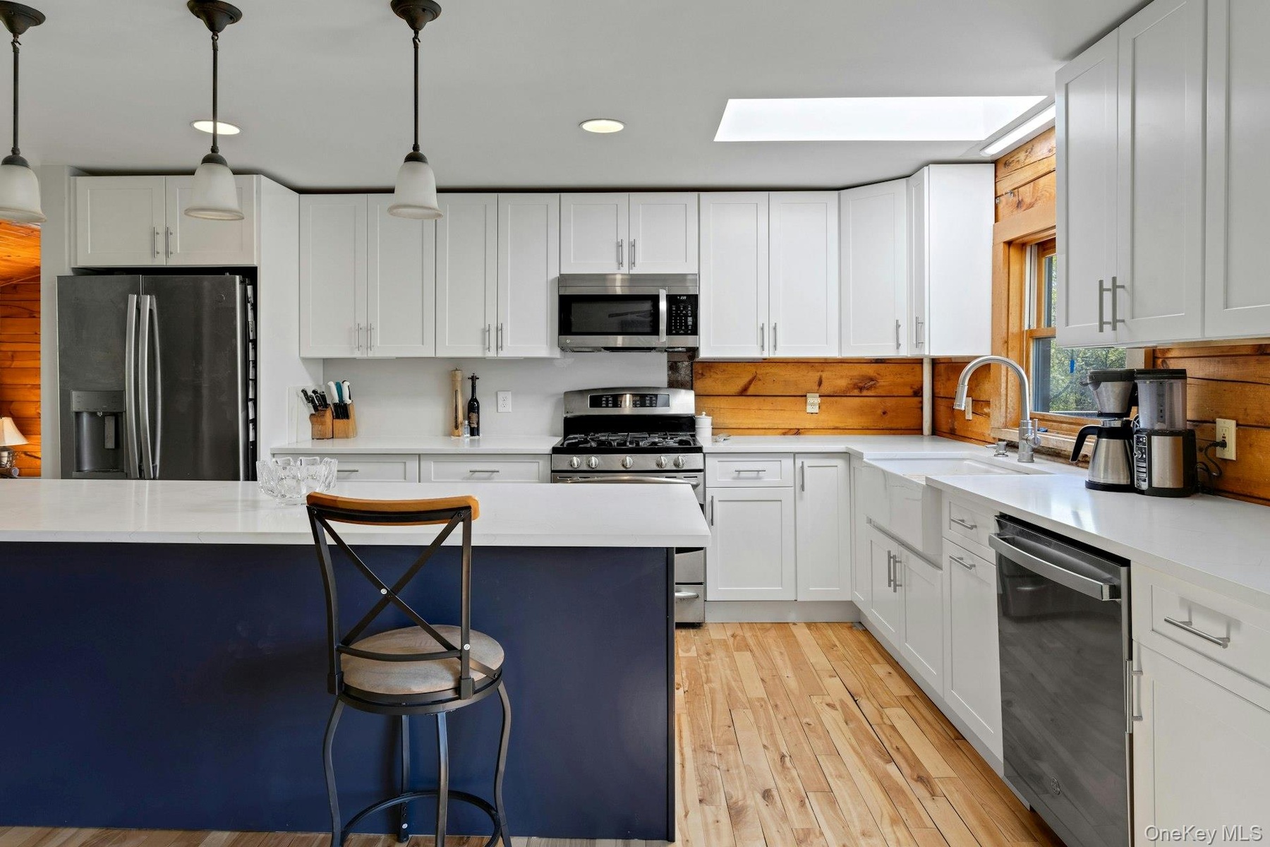 - Kitchen with stainless steel appliances, a sink, light countertops, white cabinets, and a skylight