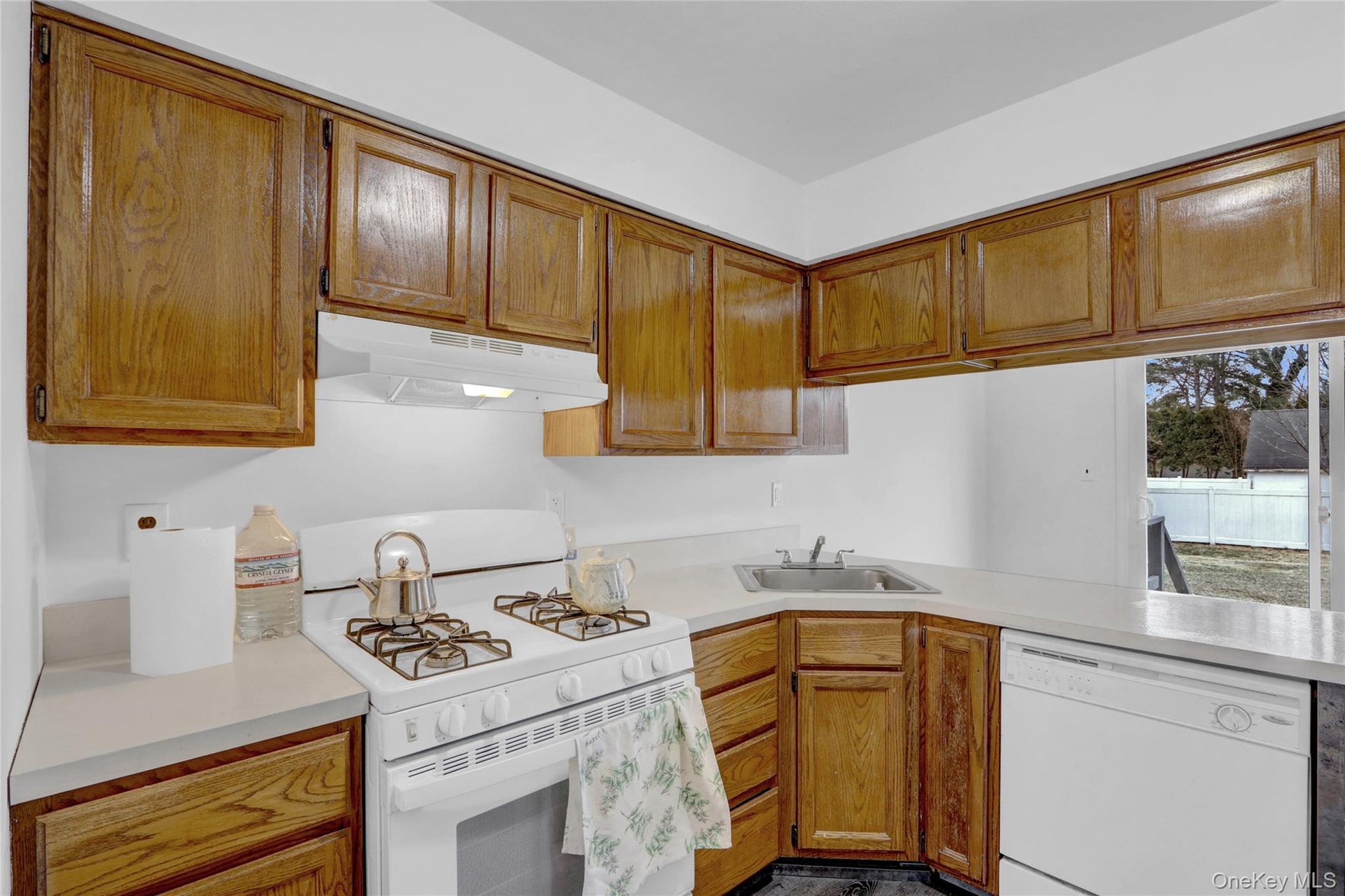 - Kitchen featuring white appliances, under cabinet range hood, light countertops, and brown cabinets