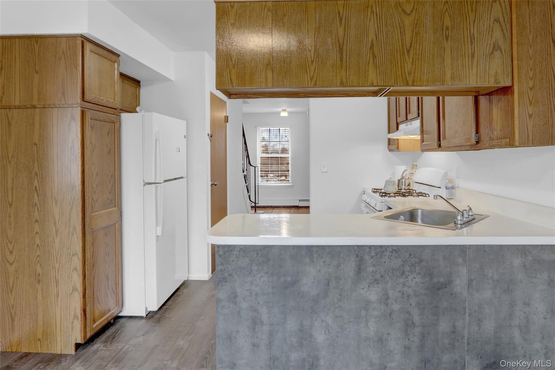 - Kitchen with white appliances, under cabinet range hood, a peninsula, light countertops, and wood finished floors