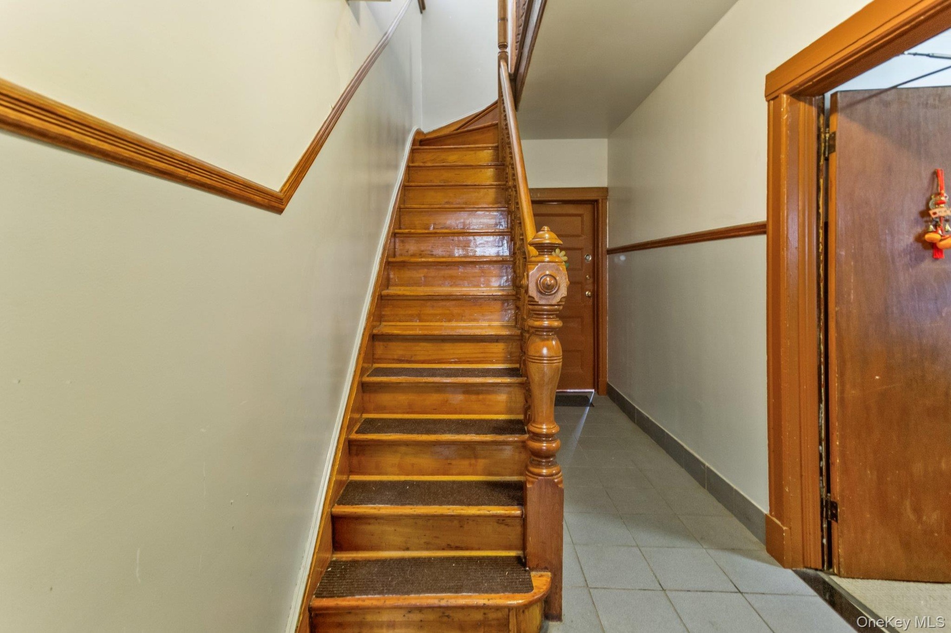 - Hallway featuring arched walkways, tile patterned flooring, and stairs