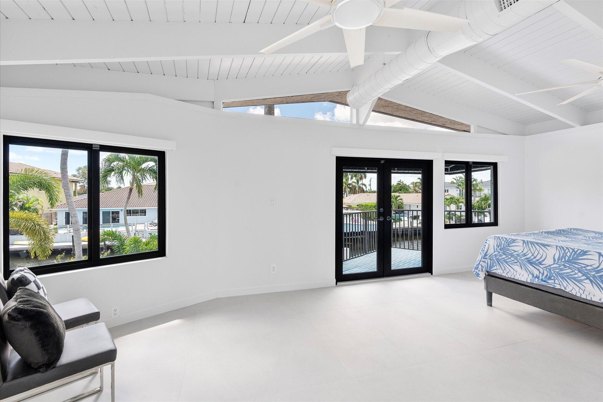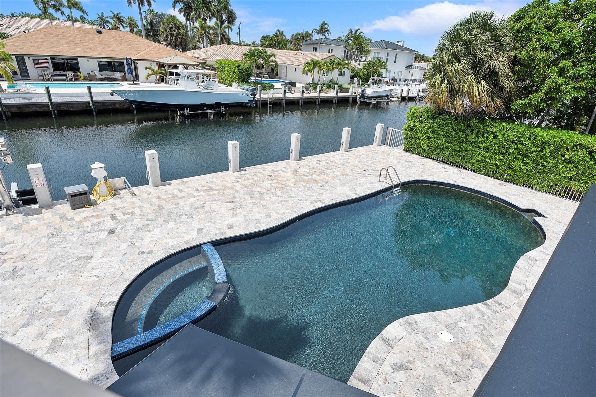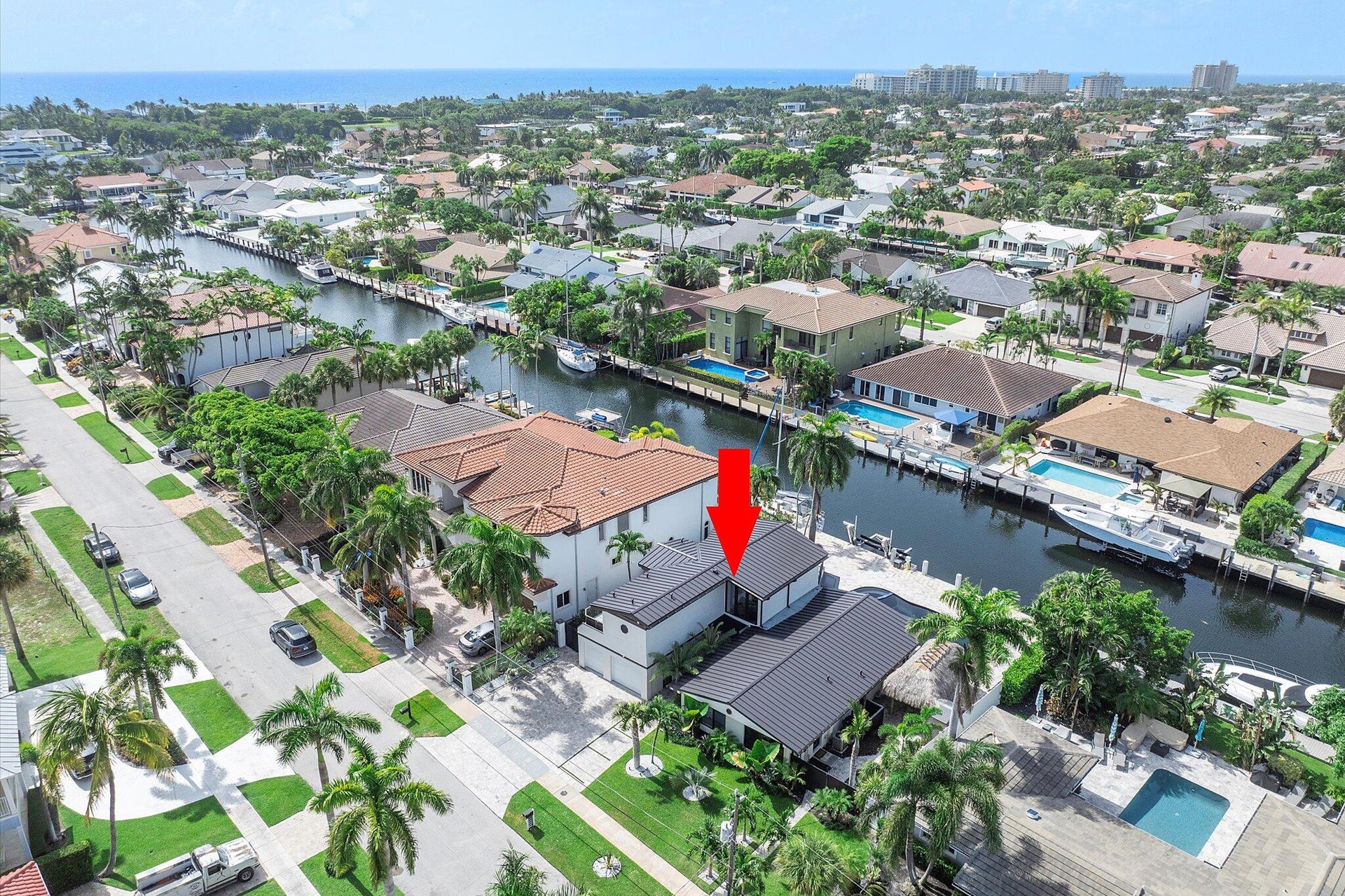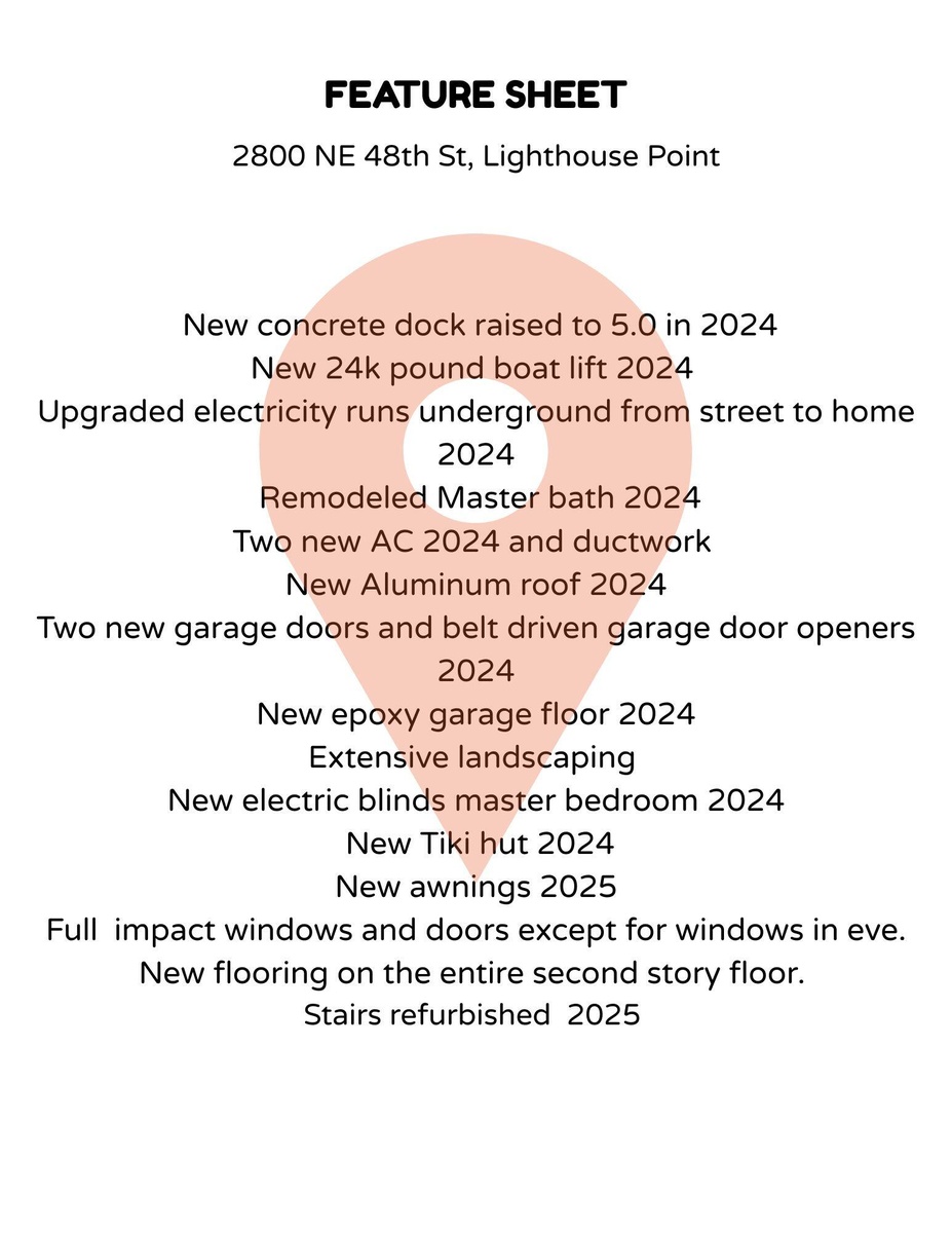 Boater's dream home located on a deepwater canal with no fixed bridges in Lighthouse Point offers the best of South Florida living--whether you're an avid boater, outdoor entertainer, or simply looking for a move-in-ready waterfront property. The home includes an 80-foot dock, fully rebuilt in 2024 with raised concrete (to 5.0 elevation), along with a 24,000 lb boat lift. A new aluminum roof was installed in 2024, along with an upgraded electrical system and two new A/C units with all-new ductwork. The home has a split floor plan, with the primary suite located upstairs for added privacy and the additional bedrooms downstairs on the opposite side of the house.