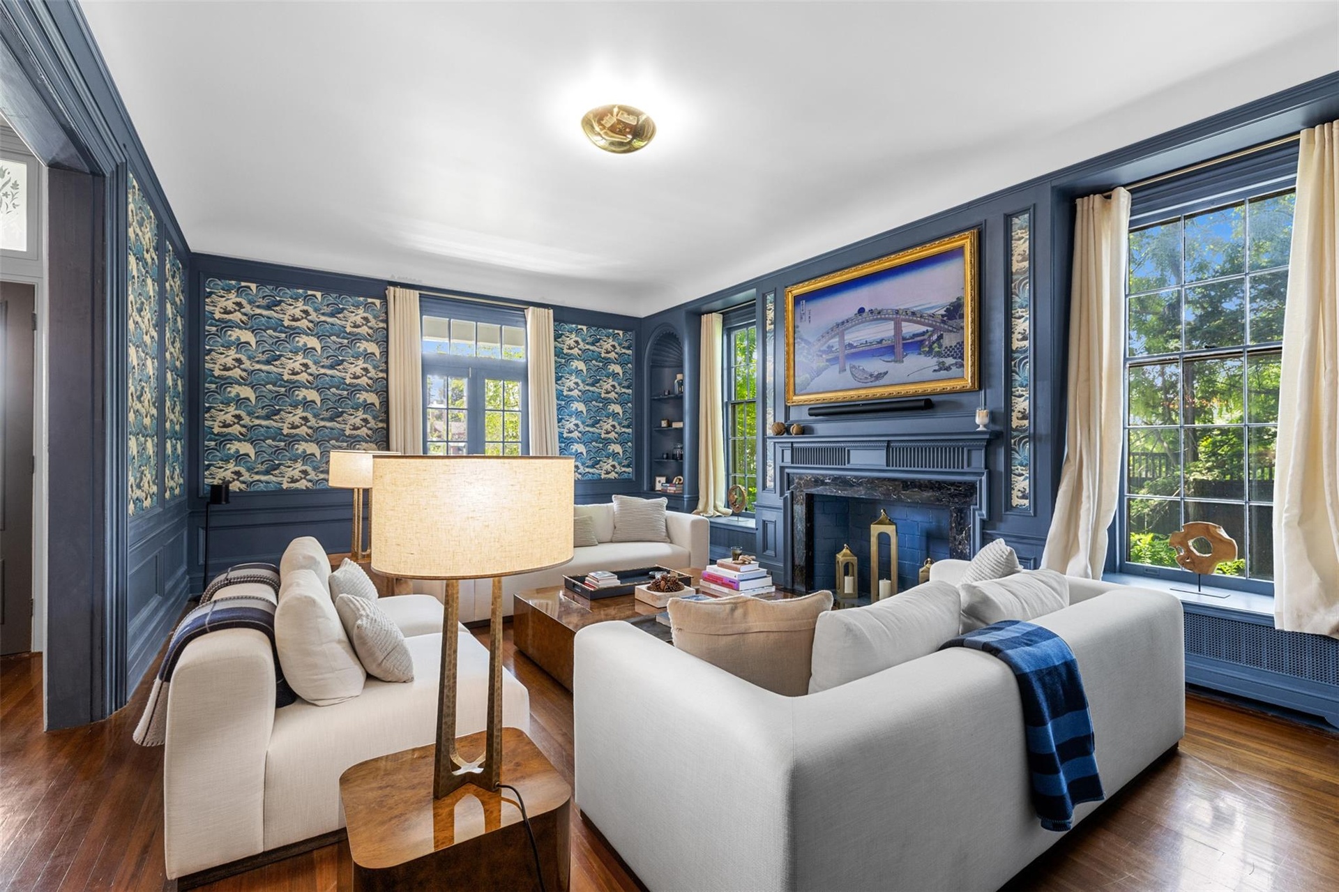 - Living area with a decorative wall, a high end fireplace, dark wood finished floors, and radiator