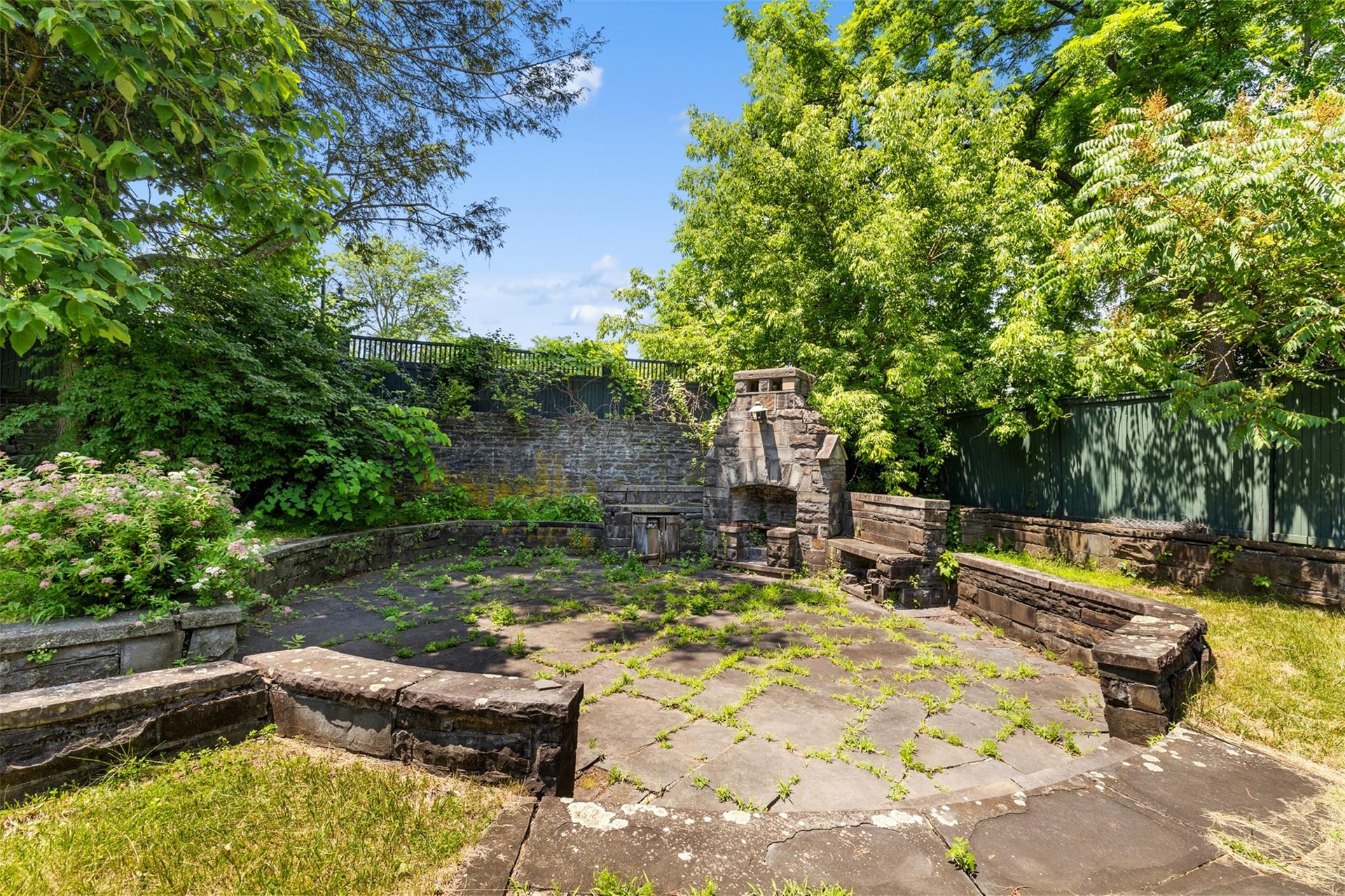 - Fenced backyard featuring an outdoor stone fireplace and a patio area