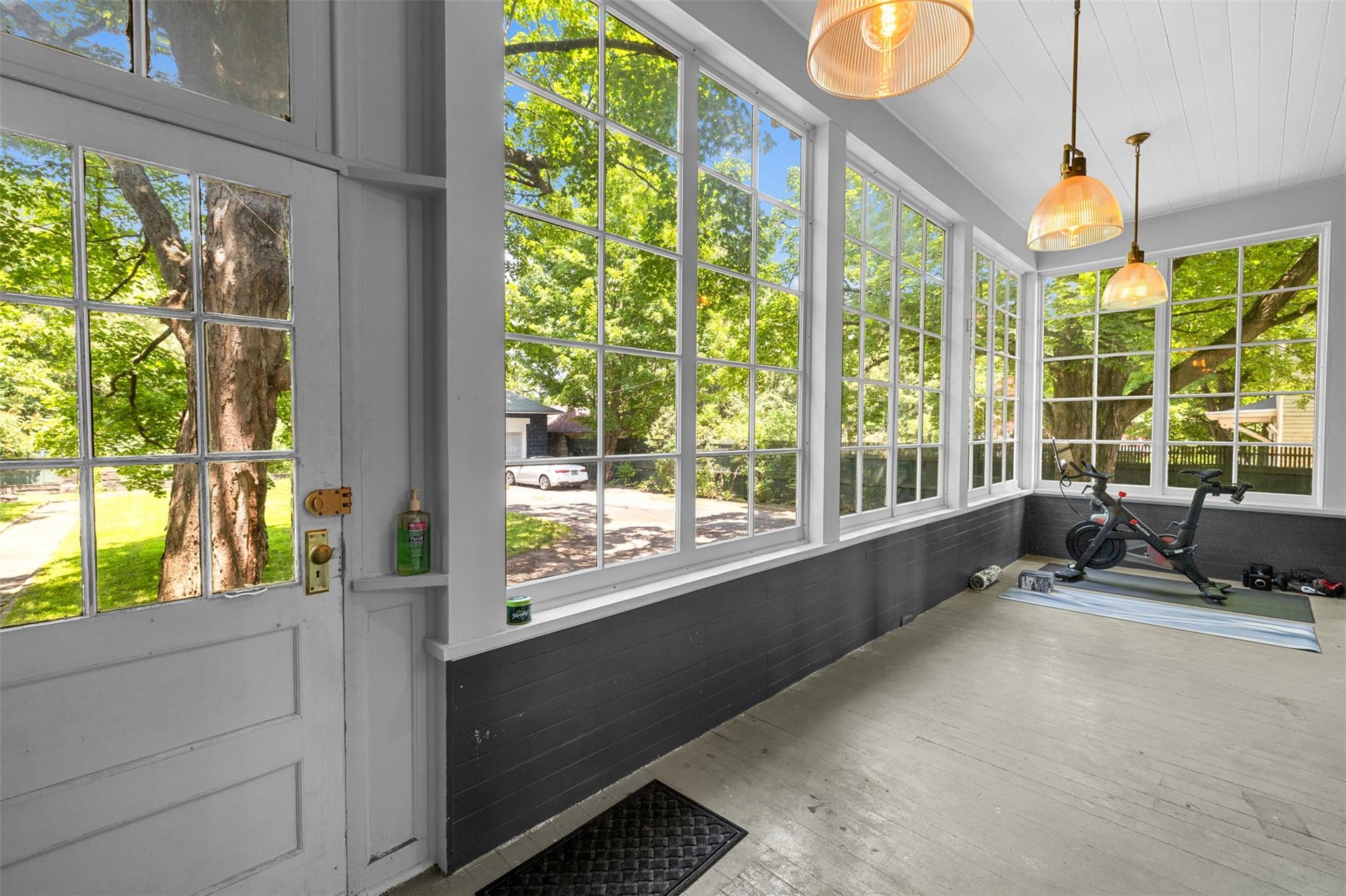 - Bedroom with a chandelier, multiple windows, and wood finished floors