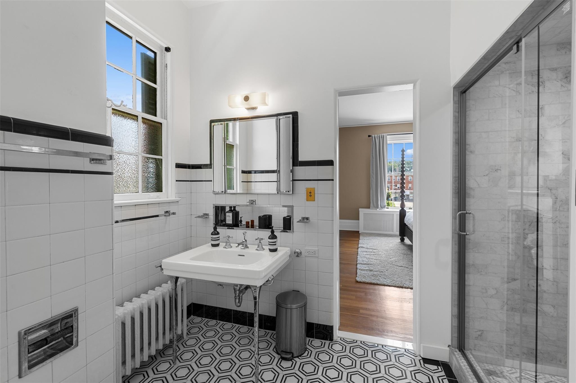 - Full bathroom featuring radiator heating unit, tile walls, a stall shower, wainscoting, and tile patterned flooring