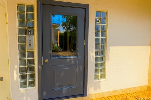 - Property entrance featuring stucco siding, a garage, driveway, and a water view