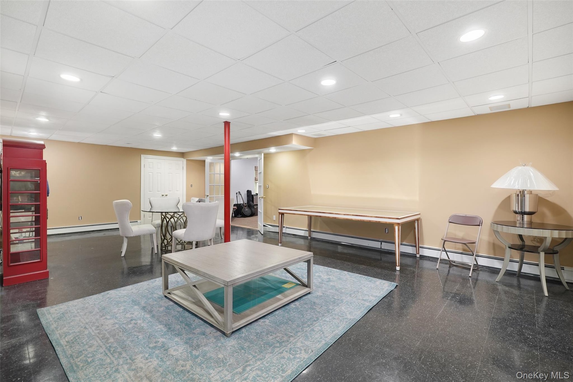 - Living room featuring a baseboard heating unit, recessed lighting, and a drop ceiling