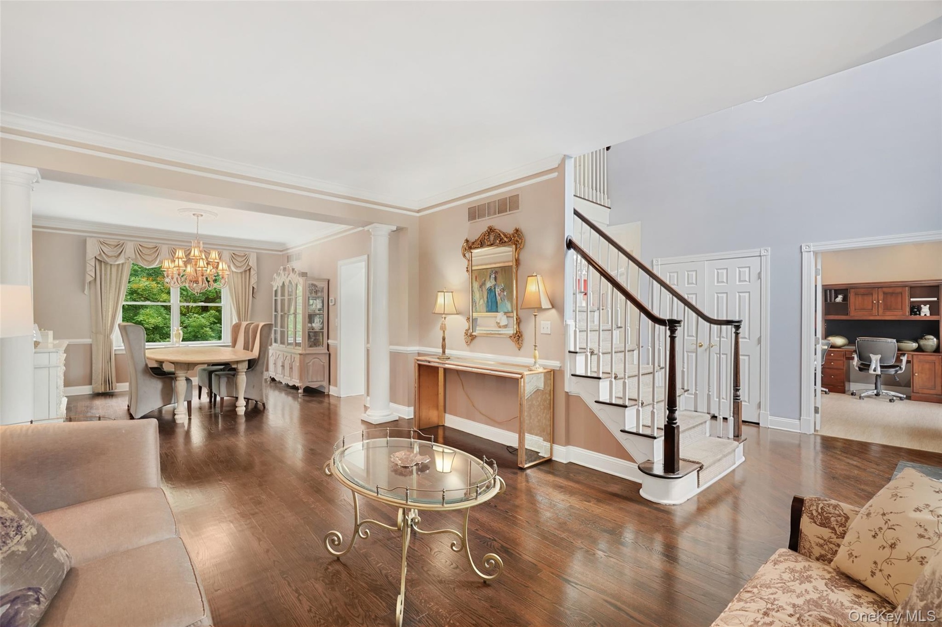 - Living area with decorative columns, wood finished floors, a chandelier, stairs, and crown molding