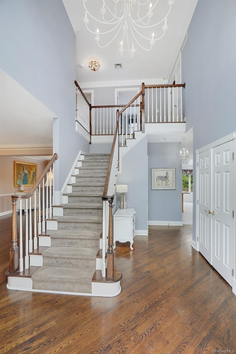 - Staircase with a chandelier, a high ceiling, and wood finished floors