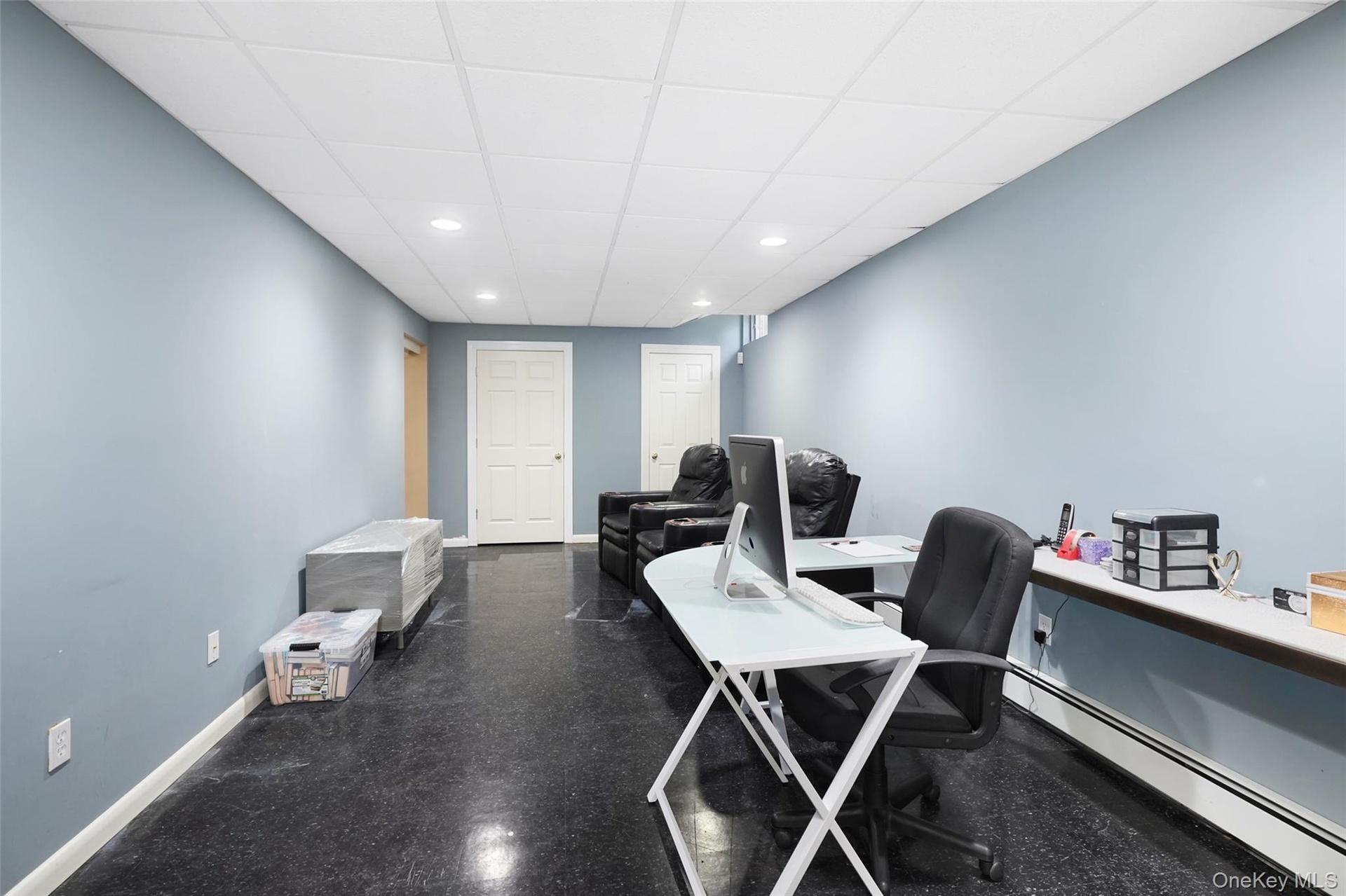 - Office area with a baseboard radiator, recessed lighting, and a paneled ceiling