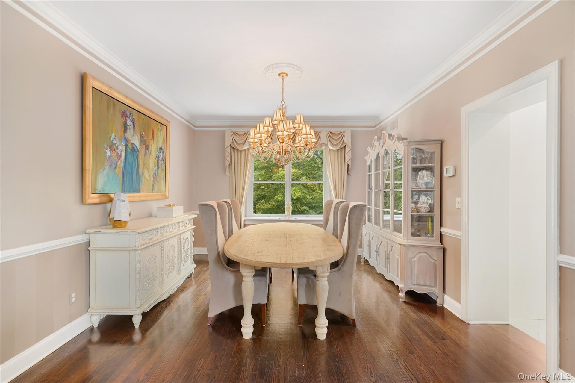 - Dining space featuring a chandelier, wood finished floors, and ornamental molding