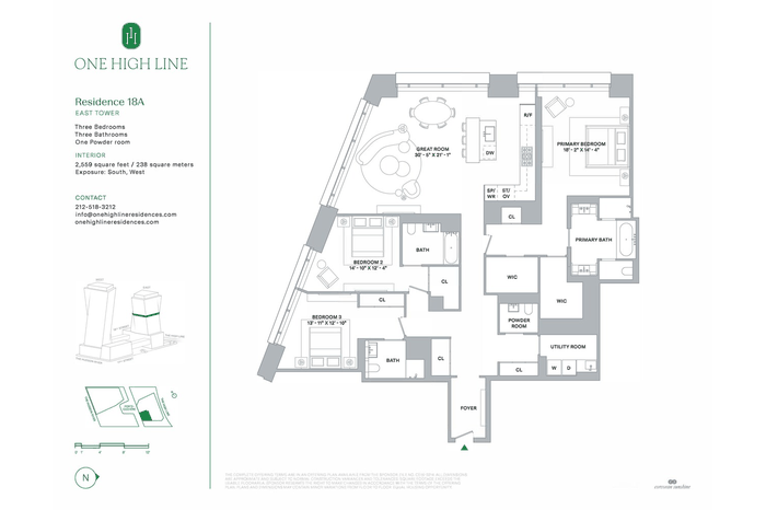 East 18A at One High Line is a 2,559 2 SF three-bedroom and three-and-a-half-bathroom residence curated by Gilles & Boissier, boasting Hudson River. Residence 19A features southern and western exposure overlooking the Hudson River and receiving an abundance of natural light throughout the day.